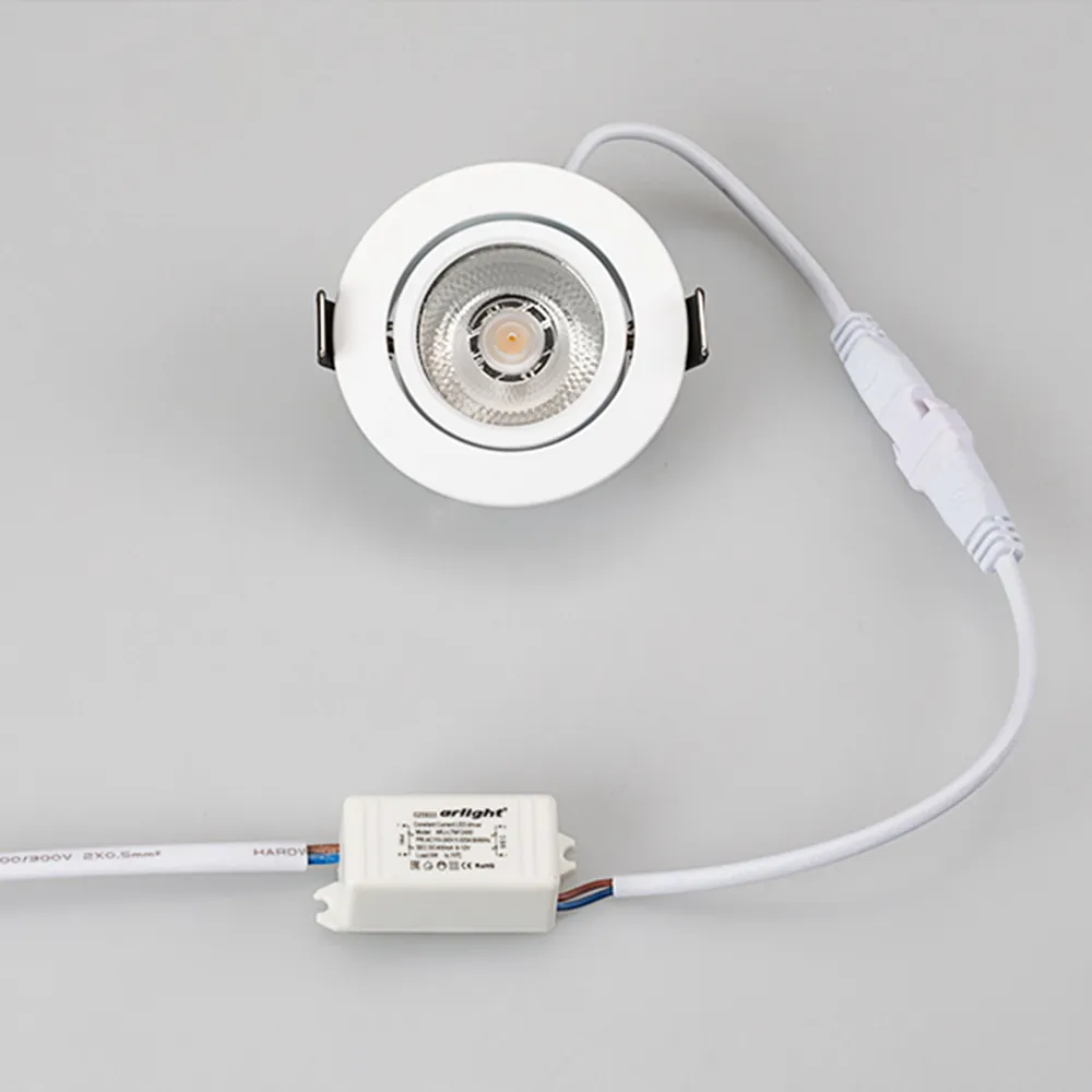 Врезной круглый мебельный светильник 5Вт, корпус белый алюминий. Цвет ТЕПЛЫЙ БЕЛЫЙ 3000K. Светодиод 1х5W Bridgelux. CRI>80, Св.поток 350-400лм, наклоняемая ось, угол 10°. Питание 180-240VAC, 5Вт, 400mA 11-13V, драйвер в комплекте. Размеры d65x20 мм, врезное отверстие d55 мм.