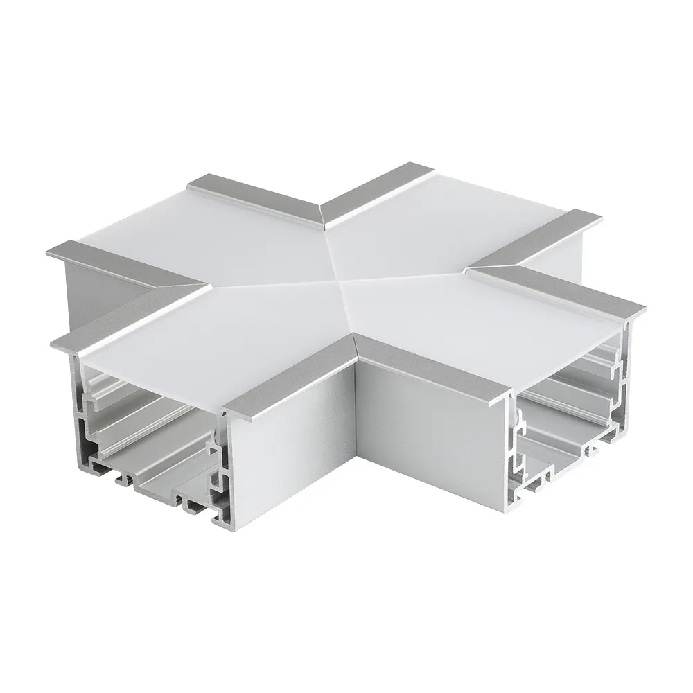 Крестовой угол в сборе, для соединения 4-х профилей S2-LINIA69-F под прямыми углами 90°. Экран образует линию "Х" на плоскости. В комплекте матовый экран, соединители. Размеры 150х150мм.