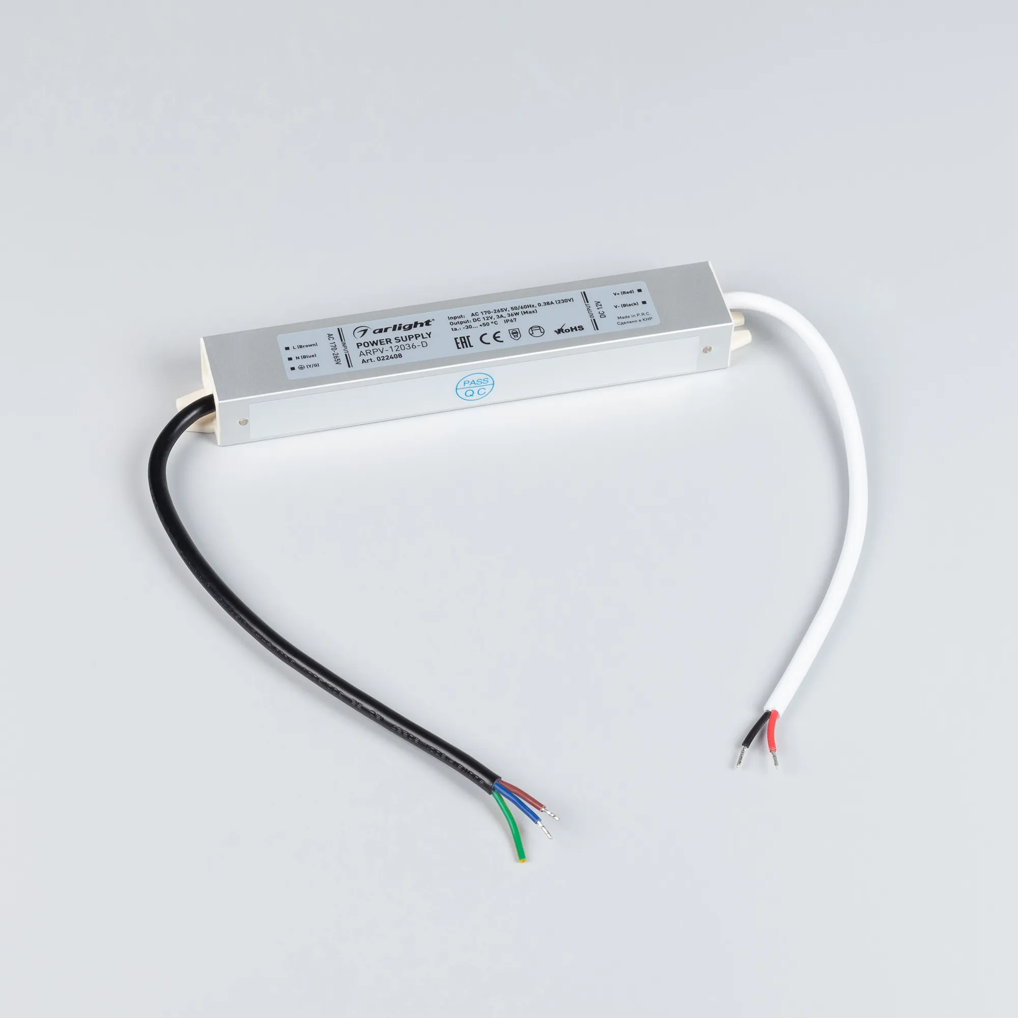 Источник напряжения с гальванической развязкой для светодиодных изделий. Входное напряжение 170-265 VAC. Выходные параметры: 12 В, 3 А, 36 Вт. Встроенный PFC >0,5. Герметичный алюминиевый корпус IP 67. Рабочая температура -30…+50C⁰. Габаритные размеры длина 182 мм, ширина 30 мм, высота 20 мм. Гарантийный срок 3 года.