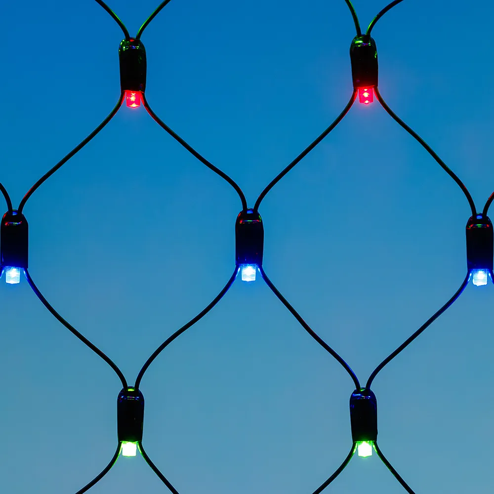 Светодиодная сеть Classic. 2500x2500 (длина 2500 мм, высота 2500 мм). Цвет свечения RGBY (светодиоды чередуются). 432 светодиода размером 7 мм со статическим и 8 динамическими эффектами свечения с резким световым рисунком (прозрачная вогнутая линза). Провод прозрачный, ПВХ. Питание 230 В, Мощность 26 Вт,защита IP65, применение в помещении и на улице под навесом Аксессуары для подключения и выбора режима свечения в комплекте.