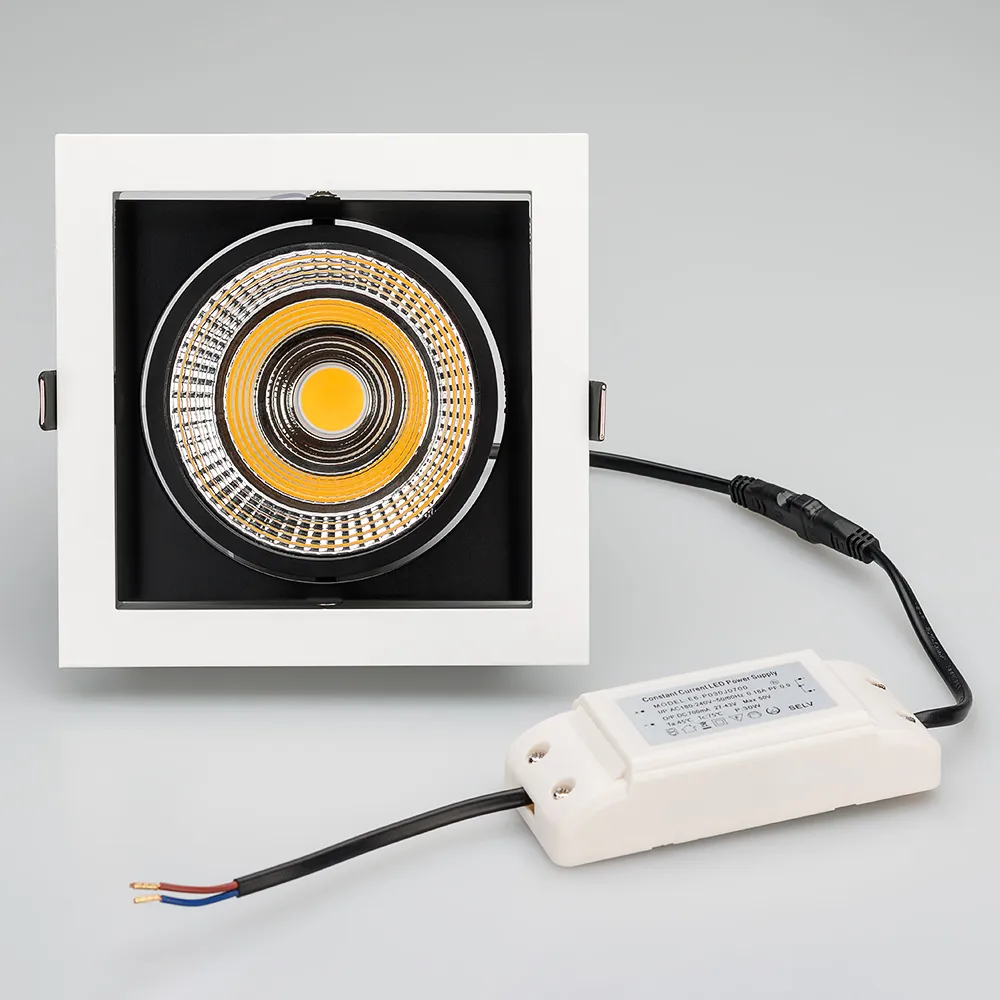 Поставка под заказ от 100 штук. Встраиваемый карданный светильник. Угол 30° / 25Вт / БЕЛЫЙ 6000K / 2200лм, CRI>90. Корпус из белого алюминия с черными вставками. Питание AC220-240V, 25Вт, 700mA 30-42V, драйвер в комплекте. Размеры LxWxH: 152х152x95мм, отверстие для установки 140x140мм.