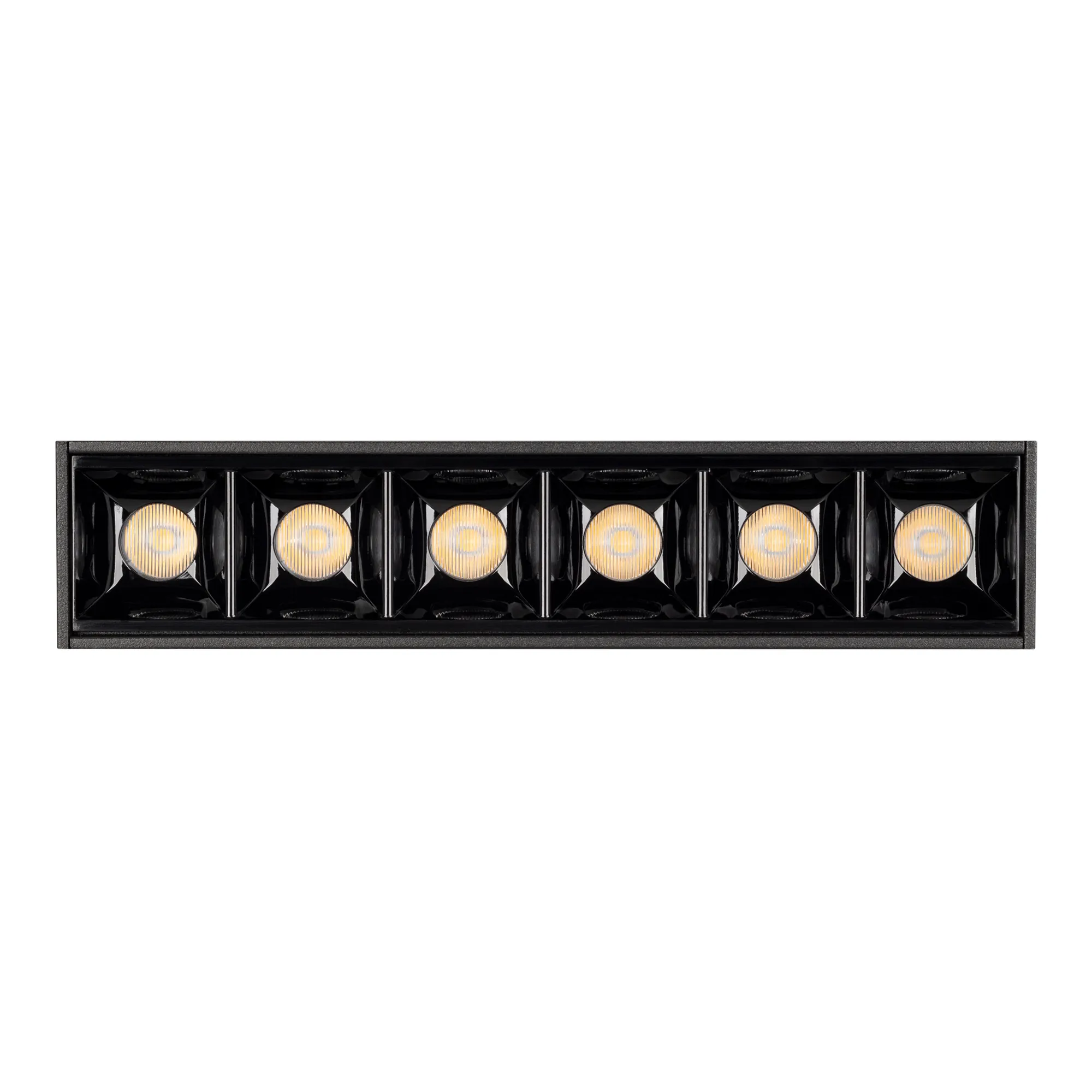 Светильник для магнитных треков шириной 45мм, 6Вт. Цвет свечения ДНЕВНОЙ 4000K, световой поток 455лм, угол 15°, CRI>90. Корпус прямоугольный, металл, цвет черный, IP20. Размеры LxWxH 163x35x43мм. Входное напряжение DC24V, мощность 6Вт. Драйвер DС24V/AC230V поставляется отдельно. Диммируется только с 026407(1), 027633.