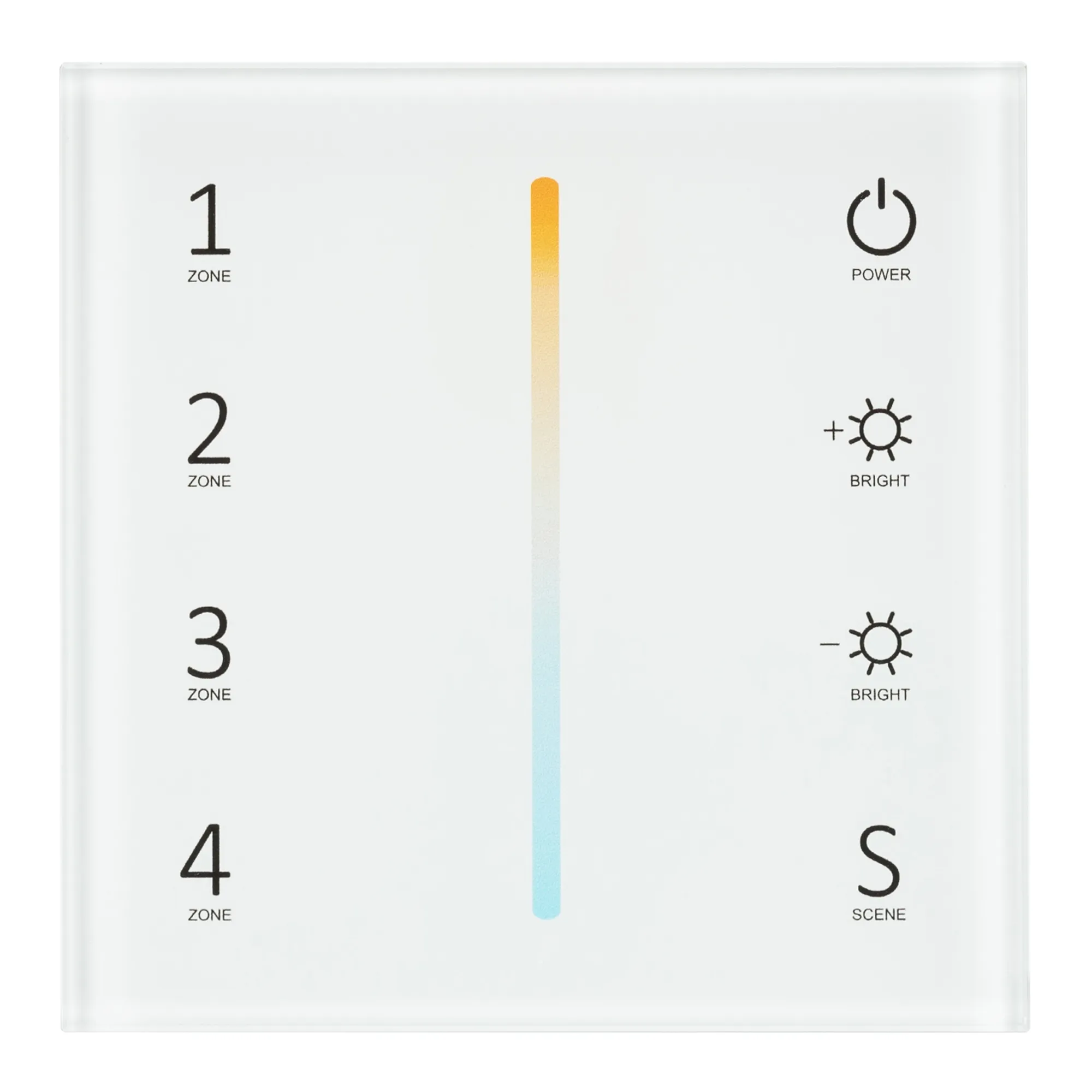 Встраиваемая сенсорная стеклянная панель 2.4 ГГц, цвет белый. Для управления температурой свечения (MIX/CCT) и яркостью с помощью сенсорной полосы. Питание/рабочее напряжение AC 100-240V, 4 зоны управления, память 4 сцен. Функция управления DMX512 устройствами. Габариты 86х86х35 мм. Панель совместима с контроллерами и пультами серии SMART.