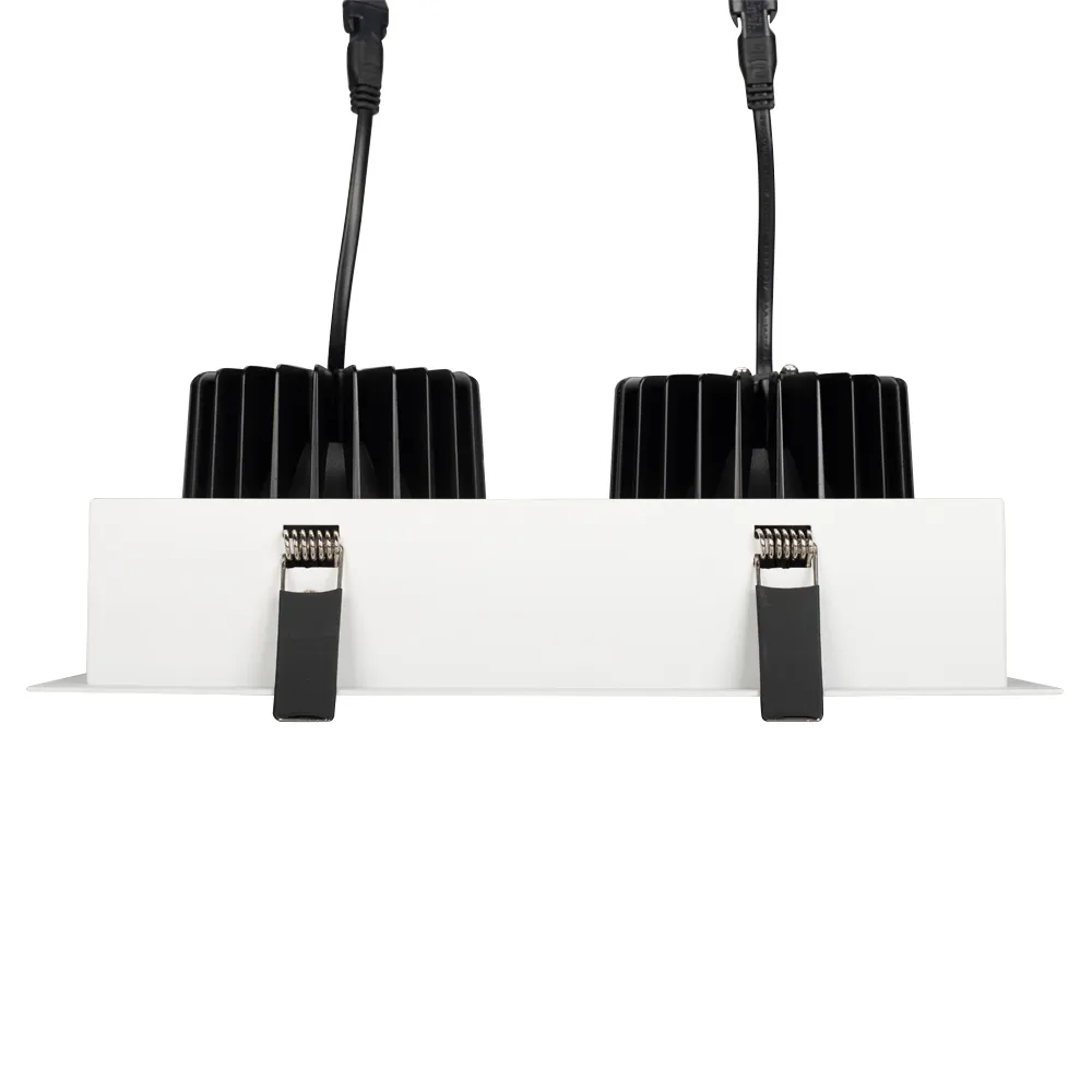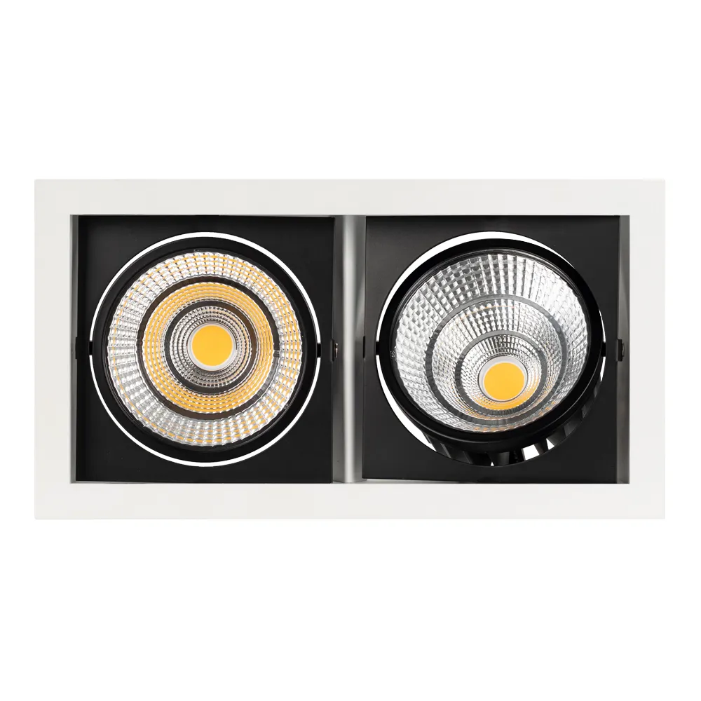Встраиваемый карданный светильник. Угол 30° / 2x25Вт / ТЕПЛЫЙ 3000K / 4800лм, CRI>90. Корпус из белого алюминия с черными вставками. Питание AC220-240V, 50Вт, 700mA 30-42V, драйвер в комплекте, 2 шт. Размеры LxWxH: 283х152x100мм, отверстие для установки 265x135мм.