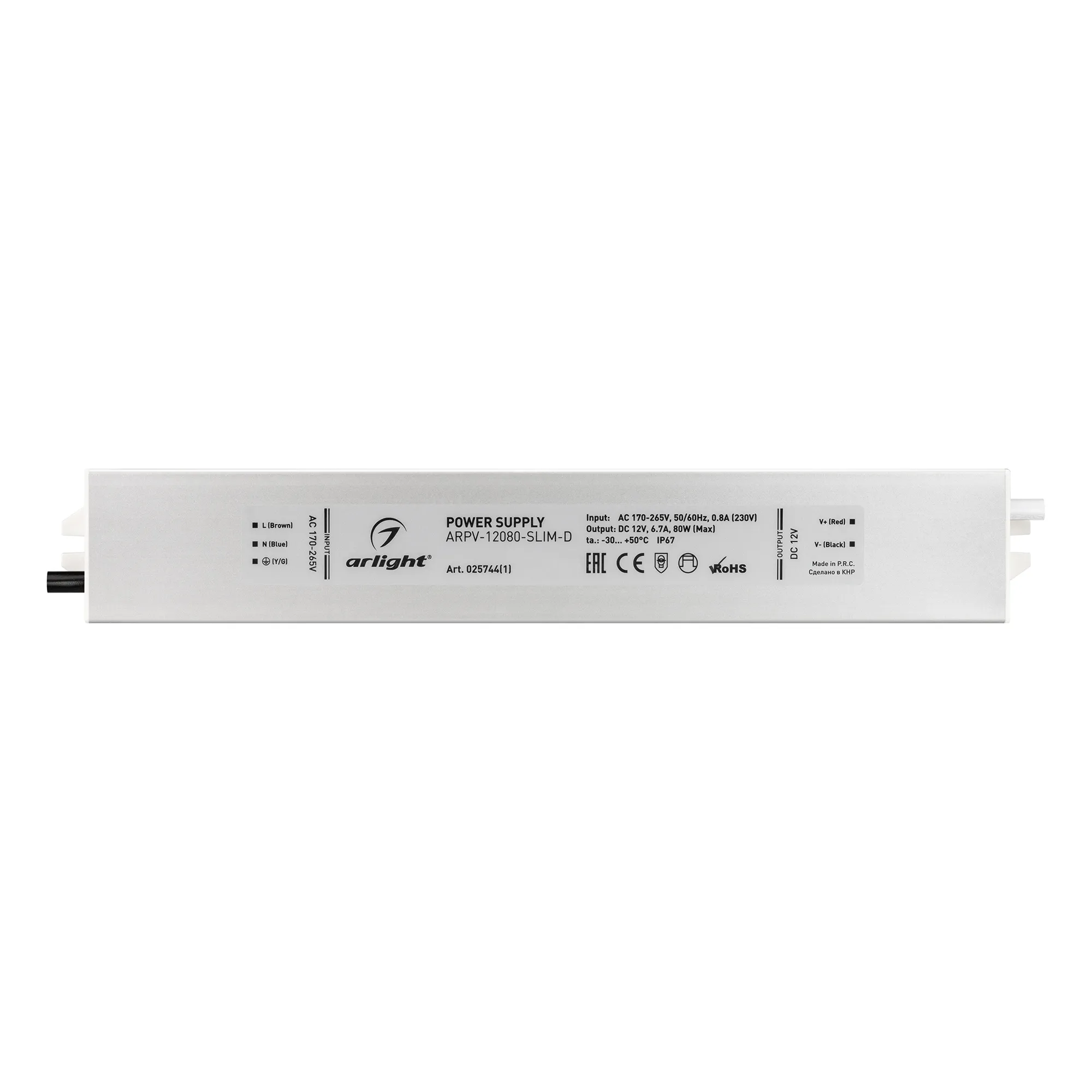 Источник напряжения с гальванической развязкой для светодиодных изделий. Входное напряжение 170-265 VAC. Выходные параметры: 12 В, 6,7 А, 80 Вт. Встроенный PFC >0,5. Герметичный алюминиевый корпус IP 67. Рабочая температура -30…+50C⁰. Габаритные размеры длина 258 мм, ширина 40 мм, высота 22 мм. Гарантийный срок 3 года.