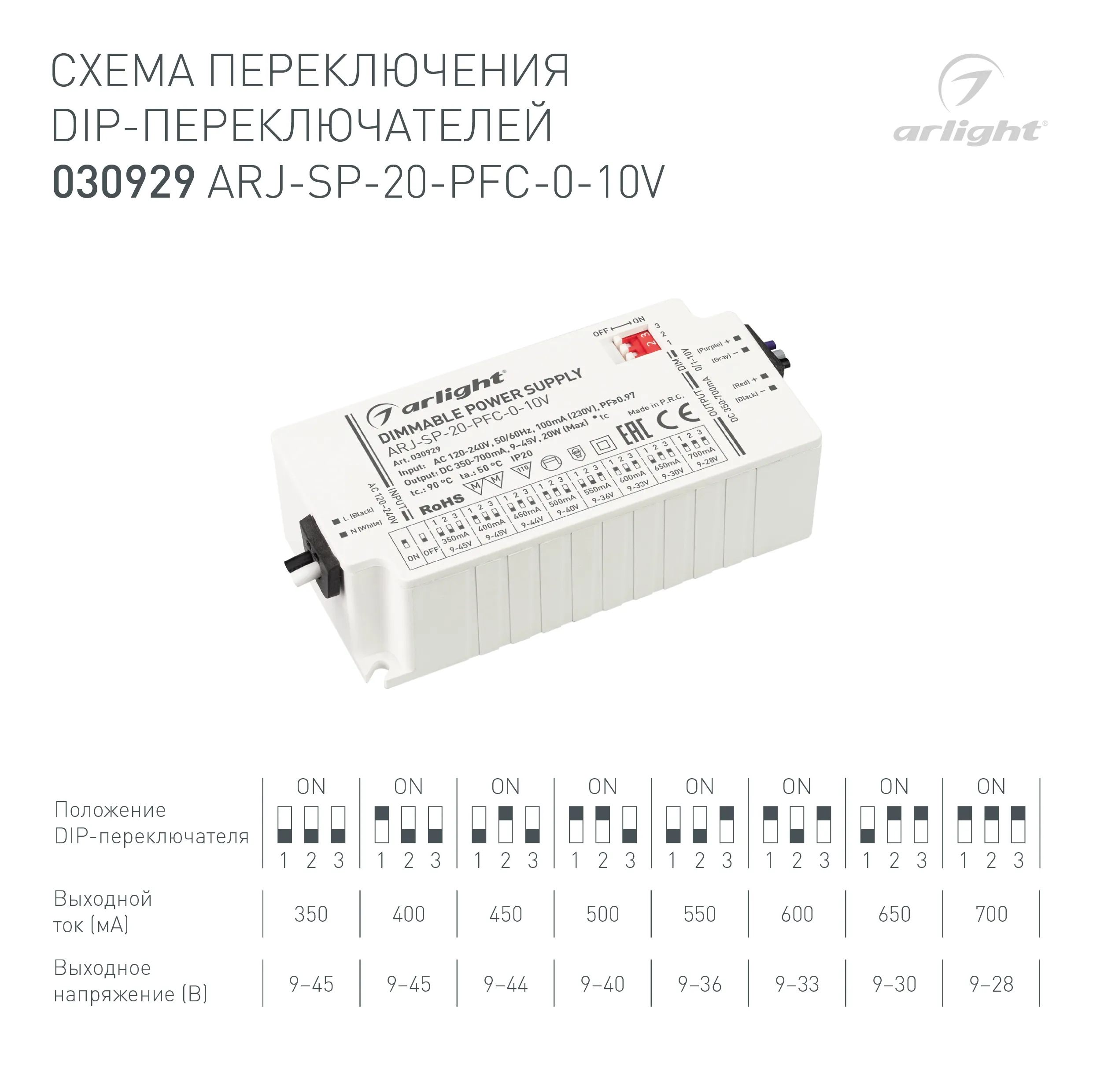 Блок питания ARJ-SP-20-PFC-0-10V (20W, 350-700mA)…