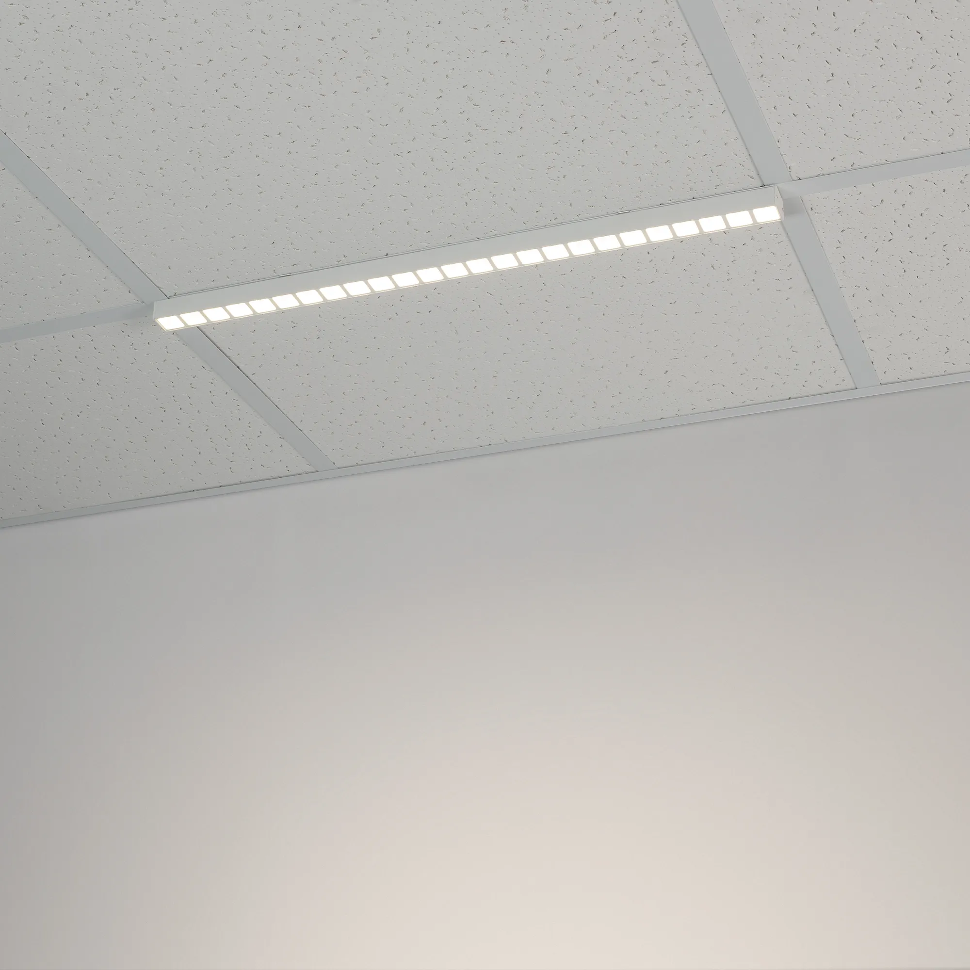Светодиодный светильник для направляющих потолка Армстронг шириной 15 и 24 мм. Мощность 28 Вт, св. поток 2690 лм, 99 лм/Вт, дневной 4000K, CRI>80, угол 80°, напряжение питания 48 В. Белый квадратный корпус из алюминия, экран PC, степень защиты IP40. Размер: длина 1200 мм, ширина 25 мм, высота 28 мм. Монтаж накладной. Драйвер поставляется отдельно.