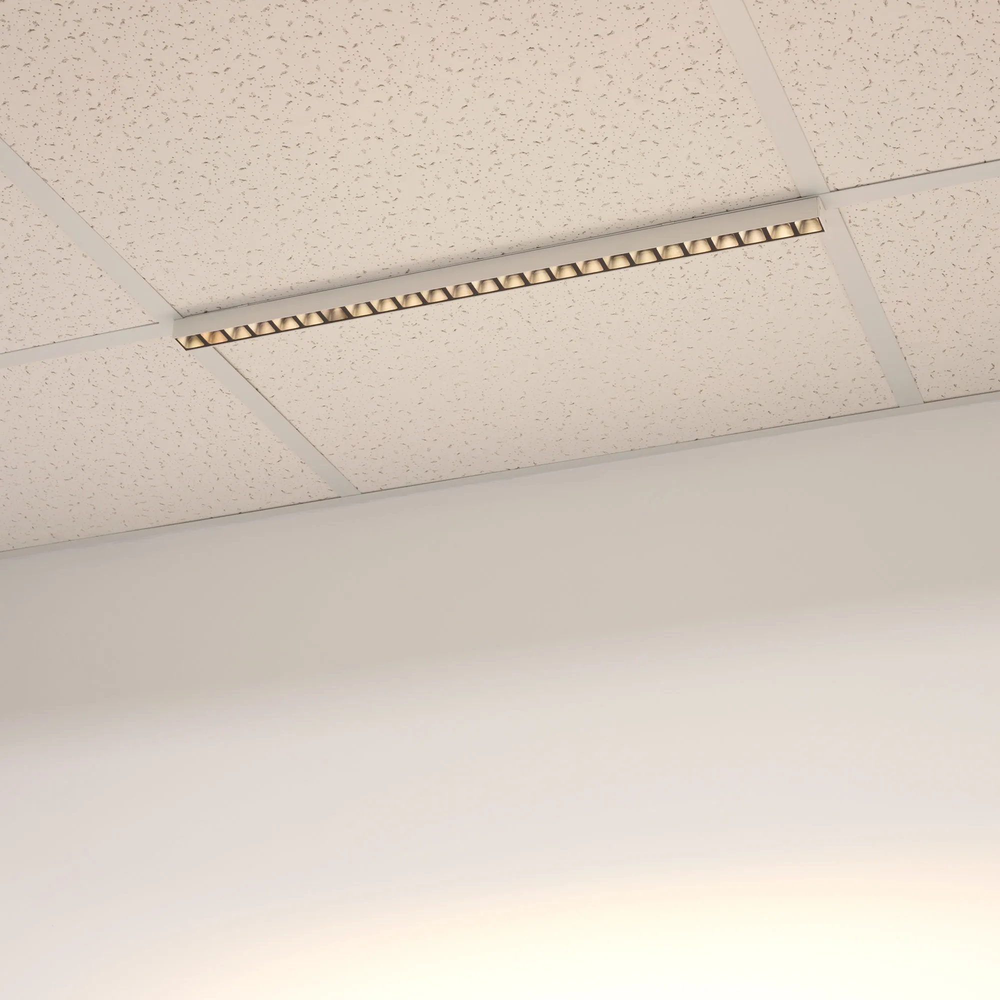 Светодиодный светильник для направляющих потолка Армстронг шириной 15 и 24 мм. Мощность 28 Вт, св. поток 2060 лм, 74 лм/Вт, теплый 3000K, CRI>80, угол 80°, напряжение питания 48 В. Белый квадратный корпус из алюминия, экран PC, степень защиты IP40. Размер: длина 1200 мм, ширина 25 мм, высота 28 мм. Монтаж накладной. Драйвер поставляется отдельно.