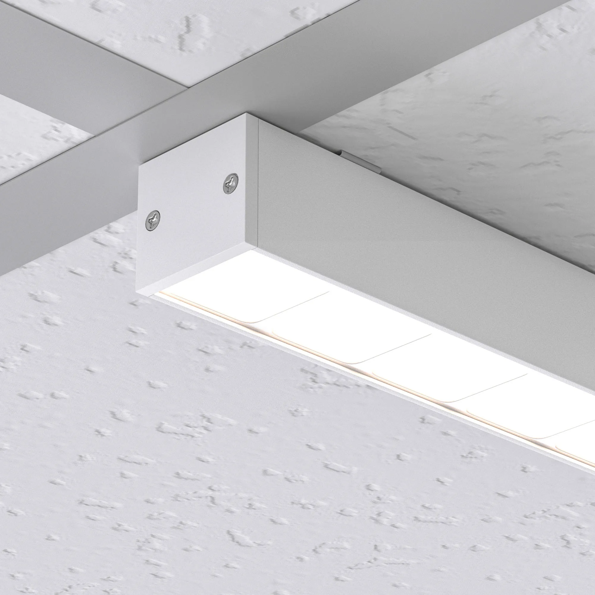 Светодиодный светильник для направляющих потолка Армстронг шириной 15 и 24 мм. Мощность 28 Вт, св. поток 2660 лм, 97 лм/Вт, теплый 3000K, CRI>80, угол 80°, напряжение питания 48 В. Белый квадратный корпус из алюминия, экран PC, степень защиты IP40. Размер: длина 1200 мм, ширина 25 мм, высота 28 мм. Монтаж накладной. Драйвер поставляется отдельно.