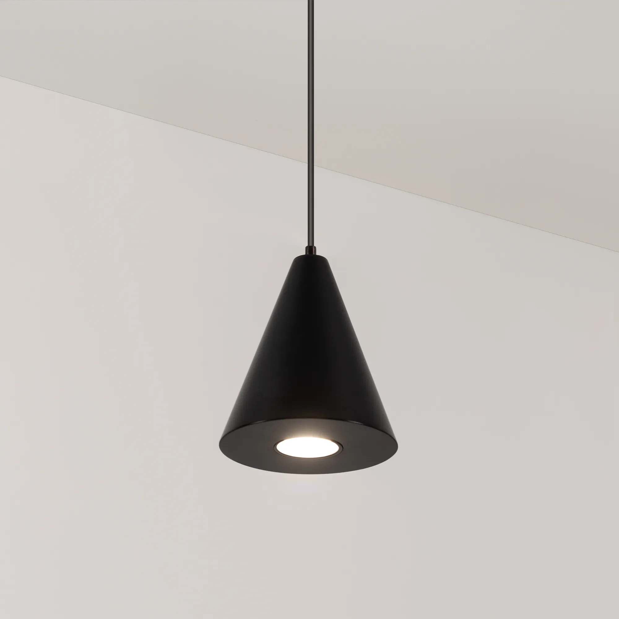 Поставка под заказ от 100 шт. Подвесной светильник. Мощность 9 Вт, св. поток 650 лм, 73 лм/Вт, дневной 4000 K, CRI>80, угол 39°, напряжение питания 230 В. Черный корпус из алюминия, степень защиты IP40. Размер: диаметр 83 мм, высота 97 мм. Монтаж подвесной, длина подвеса 1500мм, регулируемая. Габариты чаши Ø50x95 мм. Драйвер 28-42 В, 250 мА, пульсация <5%.