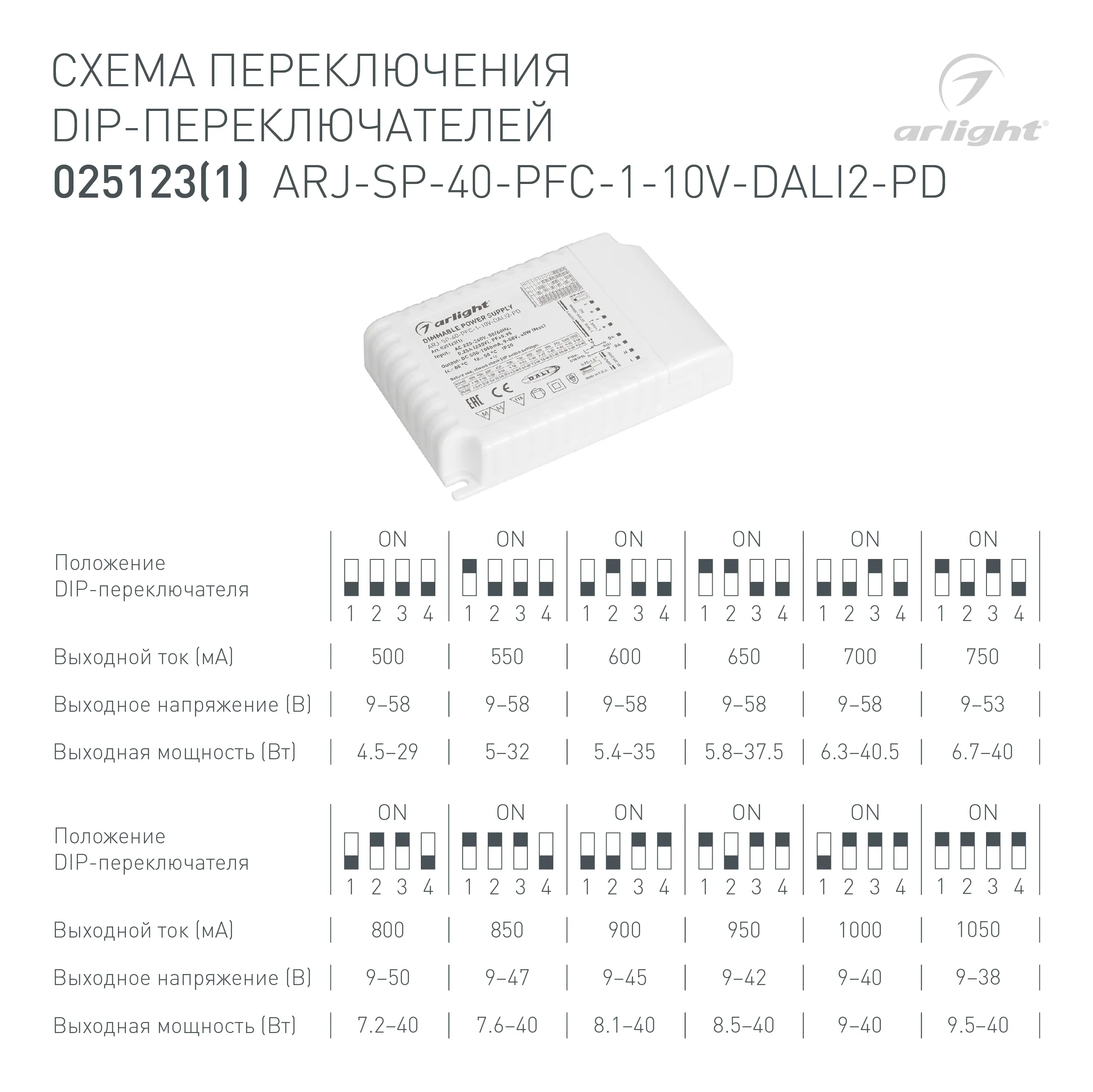 Блок питания ARJ-SP-40-PFC-1-10V-DALI2-PD (40W, 500-1050mA) (Arlight, IP20 Пластик, 5 лет)