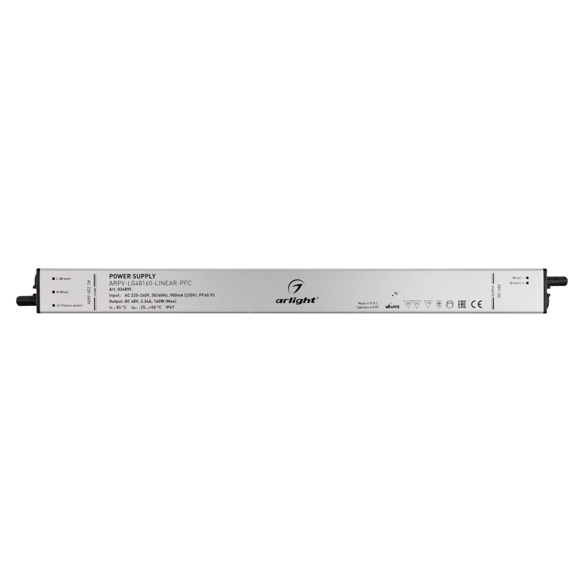 Источник напряжения с гальванической развязкой для светодиодных изделий. Входное напряжение 220-240 VAC. Выходные параметры: 48 В, 3.34 А, 160 Вт. Встроенный PFC >0.95. Тонкий металлический корпус IP67. Вход: 220-240VAC. Выход: 48VDC. Размер 350х30х21 mm. Совместимость со стандартом EMC. Гарантия 5 лет. Допускается использование только внутри помещений.
