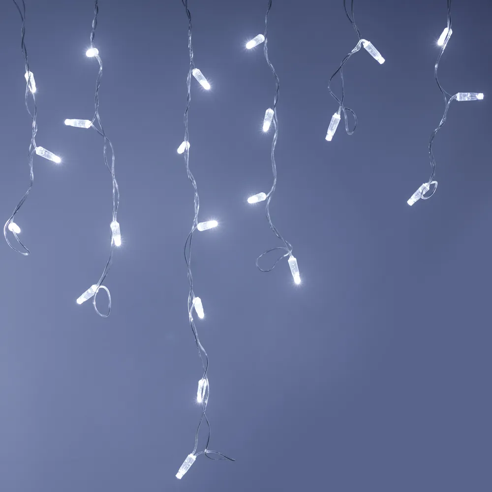 Светодиодная бахрома Classic. Размер 5600 мм (длина 5600 мм, по длине 48 нитей высотой 200/900 мм). Количество светодиодов 240 шт размером 7 мм. Цвет свечения БЕЛЫЙ (6400 К). Эффект медленного мерцания каждого светодиода с резким световым рисунком (прозрачная вогнутая линза). Провод белый, ПВХ. Питание 230 В, Мощность 6 Вт, защита IP65, применение на улице под навесом. Аксессуары для подключения приобретаются отдельно.