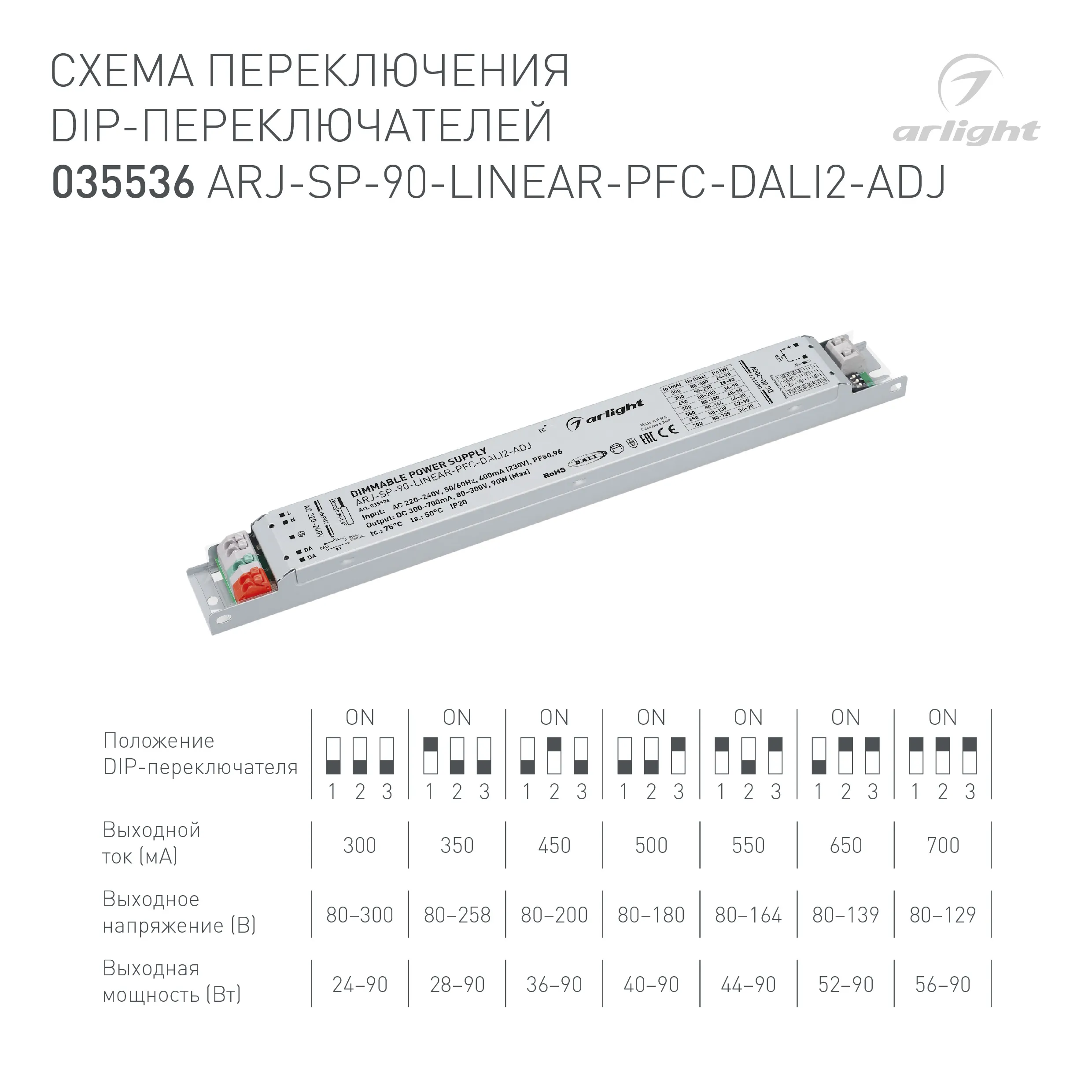 Блок питания ARJ-SP-90-LINEAR-PFC-DALI2-ADJ (90W, 80-300V, 0.3-0.7A) (Arlight, IP20 Металл, 5 лет)