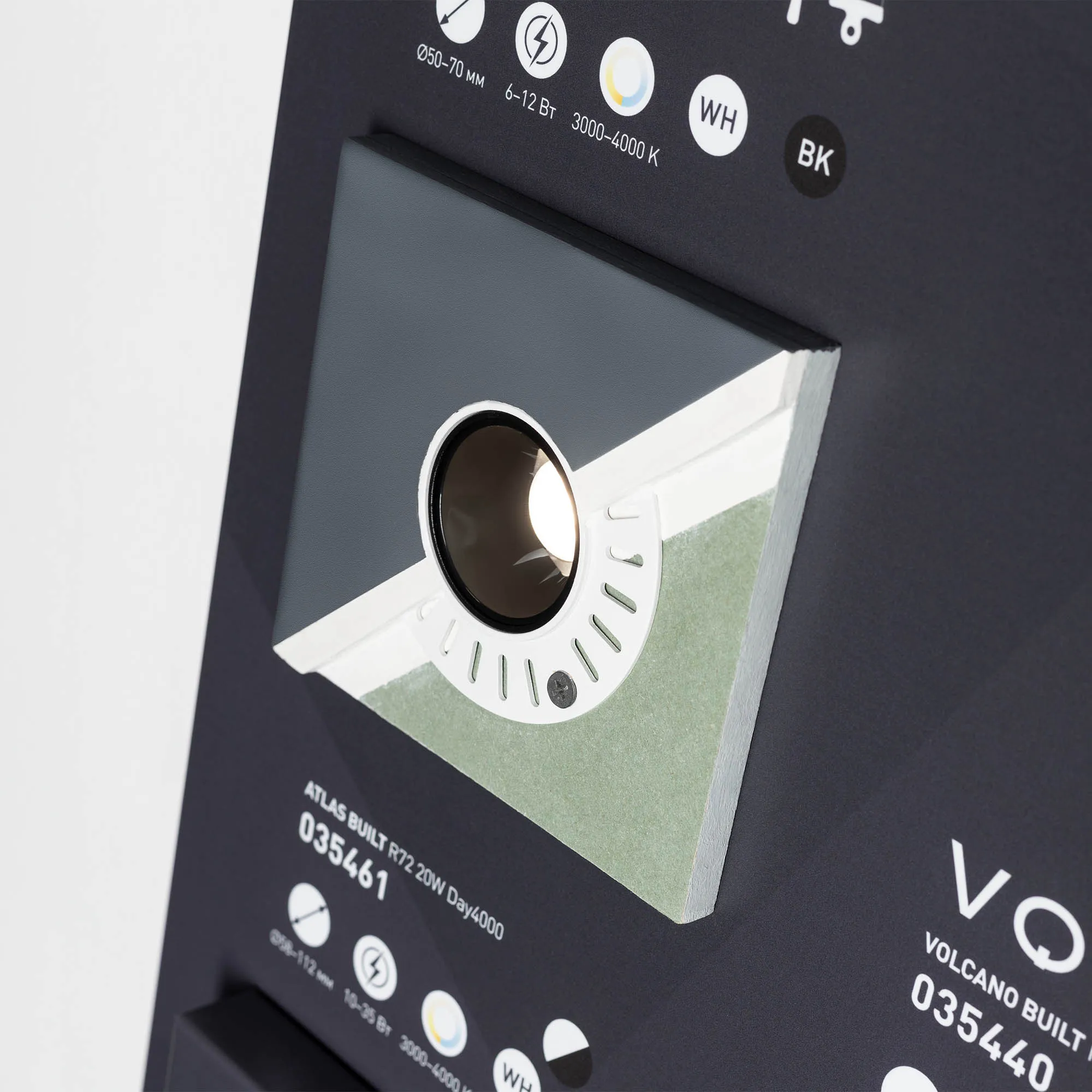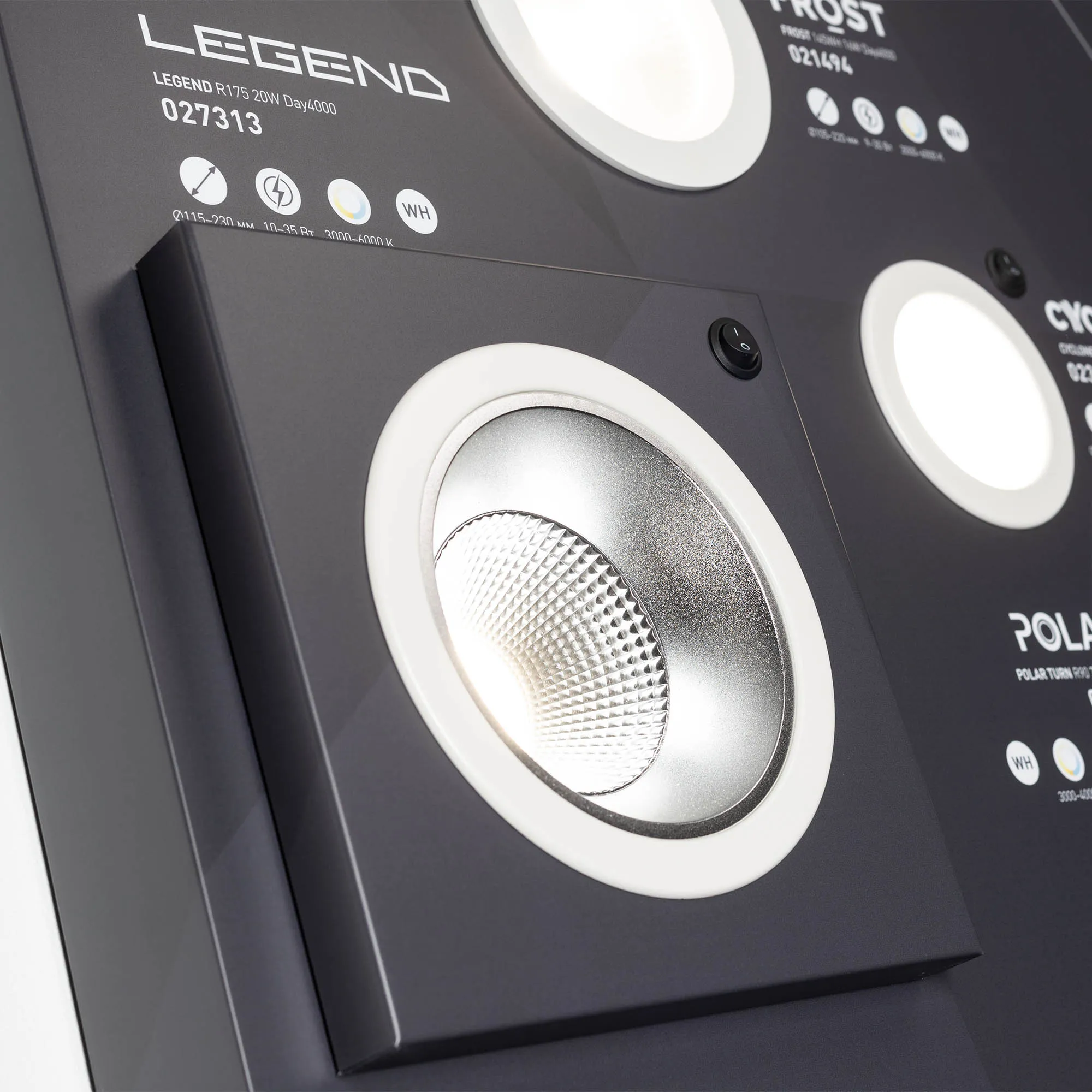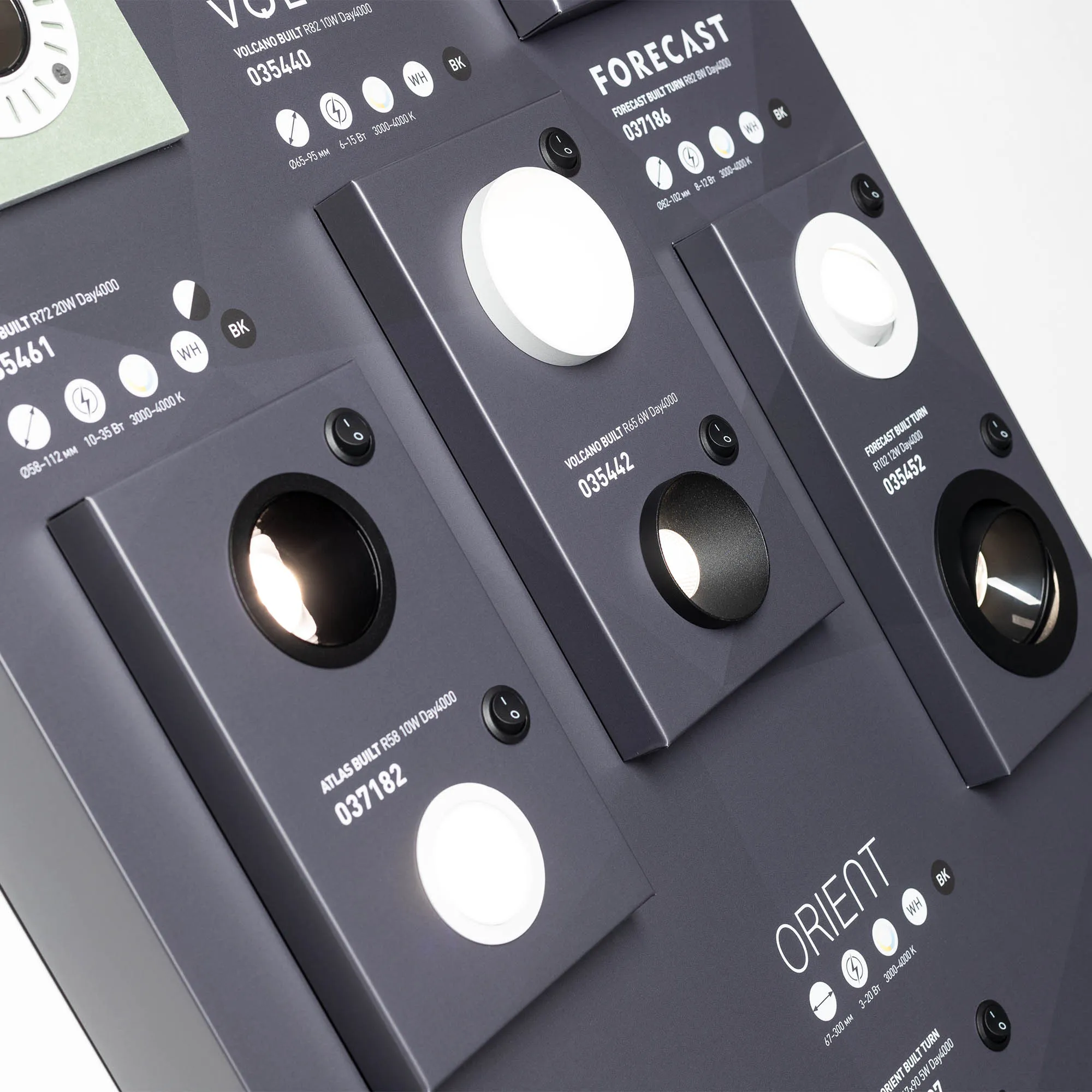 Стенд светильники даунлайты встраиваемые, серии STORM, FROST, LEGEND, CYCLONE, POLAR, EXPLORER, ATLAS-TRIMLESS, ATLAS, VOLCANO, ORIENT-BUILT,