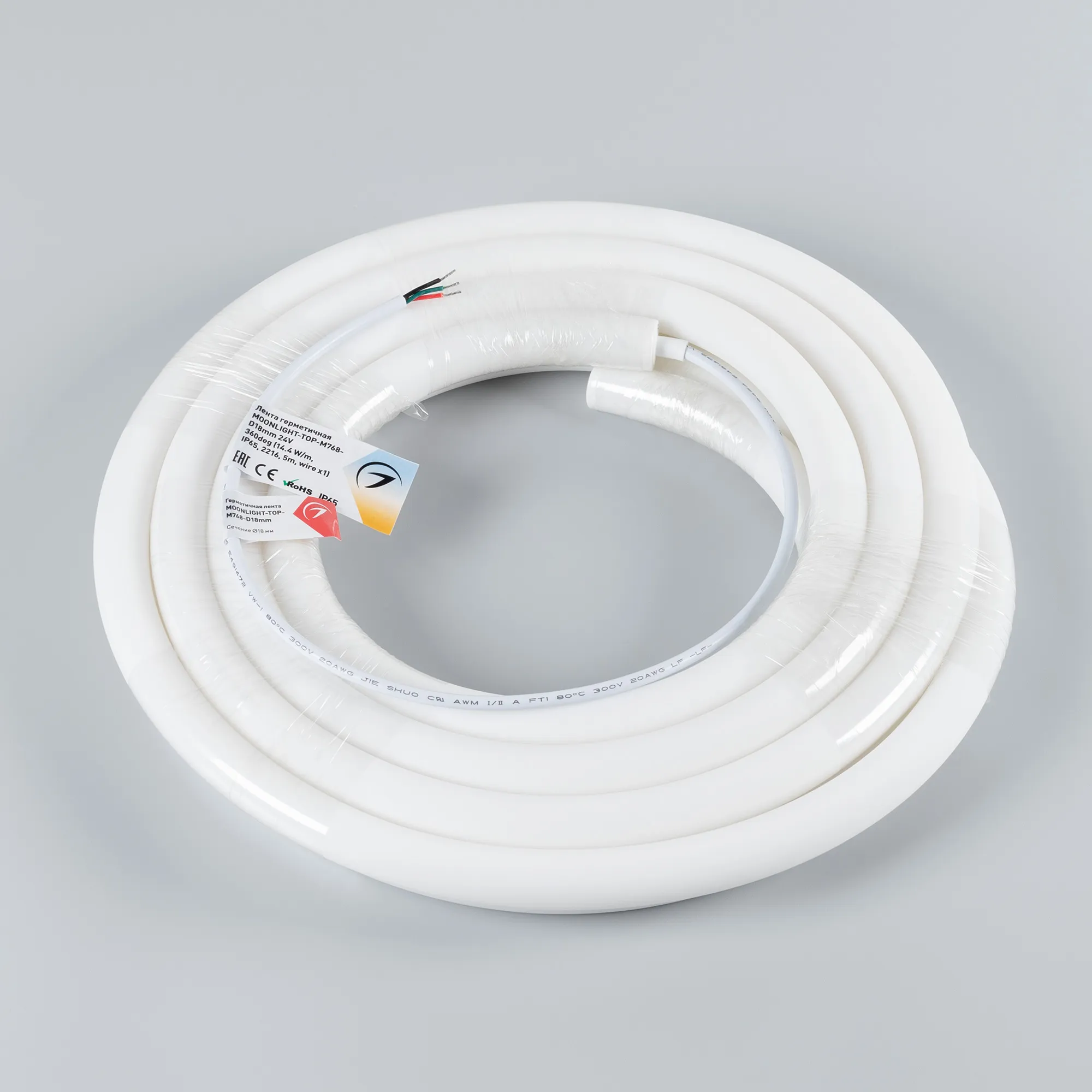 Лента светодиодная герметичная MOONLIGHT-TOP-M768-D18mm 24V White-MIX 360deg (14.4 W/m, IP65, 2216, 5m, wire x1) (Arlight, Вывод прямой, 3 года)