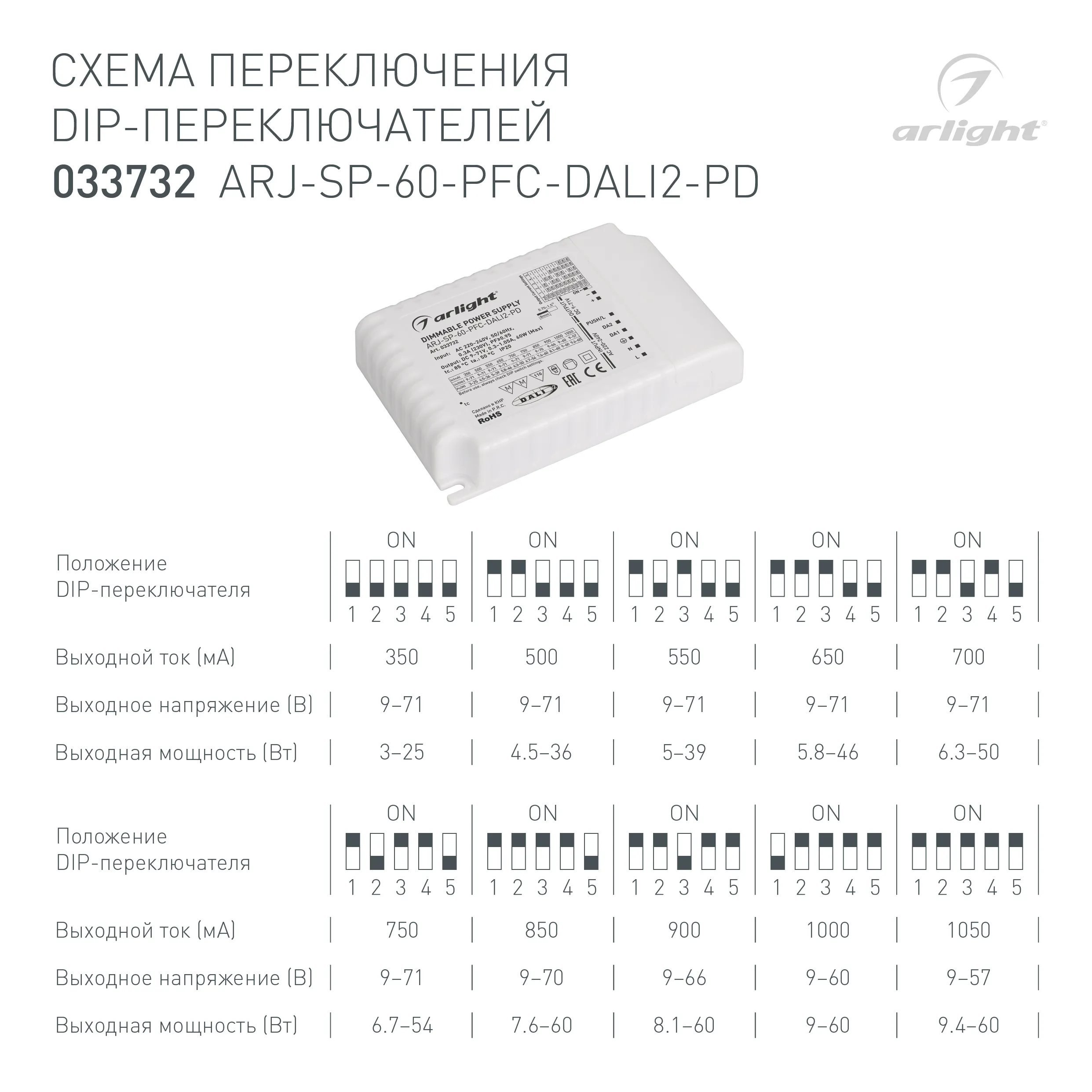 Диммируемый мультитоковый блок питания с управлением DALI 2.0 (диапазон 0.1-100%) с гальванической развязкой. Функция PUSH DIM. Входное напряжение 220-240 VAC. Выходные параметры: 9-71В (350/500/550/650/700/750мA); 9-70В (850мA); 9-66В (900мA); 9-60В (1000мA); 9-57В (1050мA), максимальная мощность 60Вт. Встроенный PFC >0.9. Негерметичный пластиковый корпус IP 20. Габаритные размеры длина 123 мм, ширина 79 мм, высота 24 мм. Гарантийный срок 5 лет.