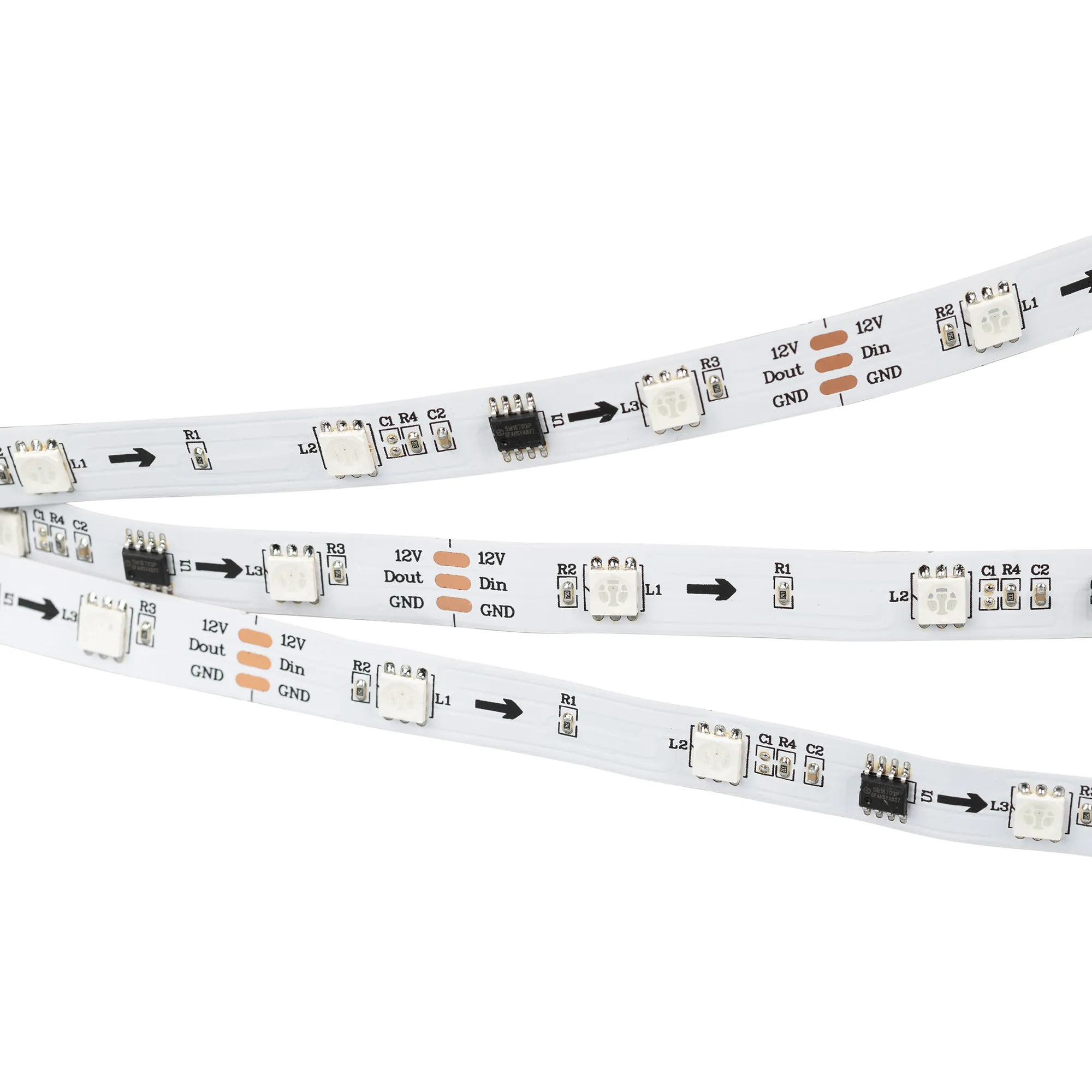 Светодиодная лента SPI серии B30 с микросхемой 16703. Светодиоды SMD 5060, 30 шт/м, 10 pixels на 1 м (50 pixels на 5 м), 1 pixel = 3 светодиодов, белая плата шириной 10 мм, скотч 3M. Цвет RGB, угол 120°. Питание 12 В, мощность 7.2 Вт/м (36 Вт на 5 м). Размеры 5000x10x2.4 мм. Мин. отрезок 100 мм, 3 светодиода. Цена за 1 м.