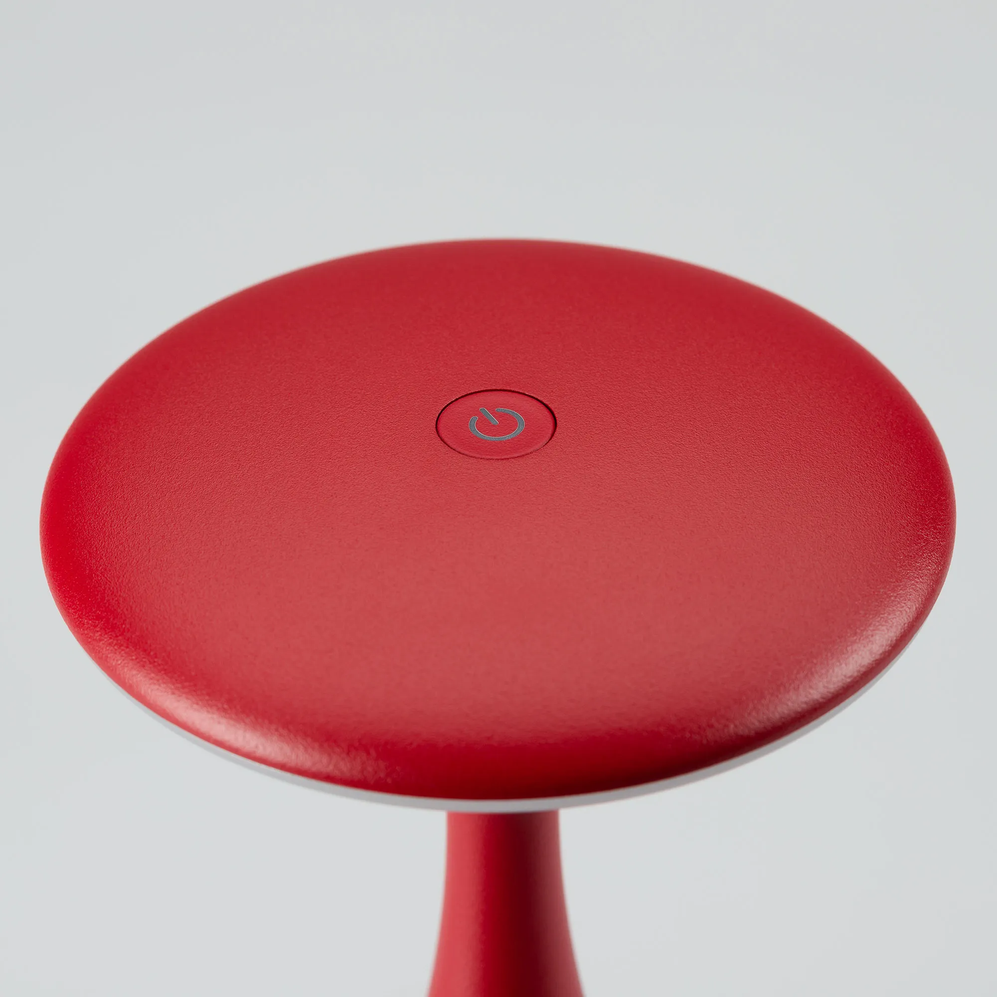 Настольный светильник со встроенным аккумулятором 1.5Вт, красный алюминиевый корпус. Цвет ТЕПЛЫЙ БЕЛЫЙ 2200-3000K, св.поток 110лм, CRI(Ra)>80, угол 123°. Размер Ф101x197мм. IP54. Зарядка от сети переменного тока AC220-240V. Тип встроенного аккумулятора 2600мАч Li-ion, напряжение батареи 3.7V