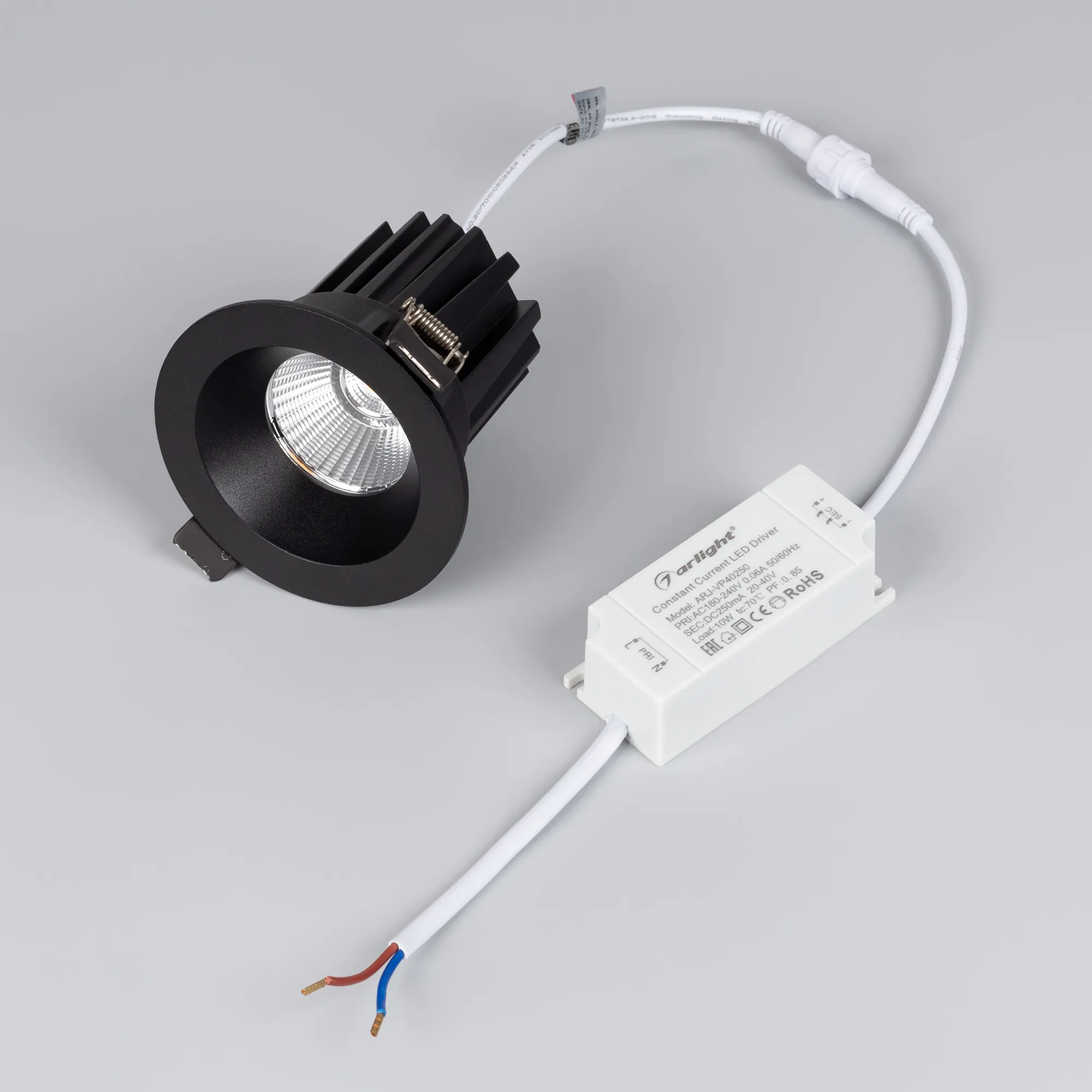 Встраиваемый светильник даунлайт. Мощность 10 Вт, св. поток 910 лм, 90 лм/Вт, дневной 4000 K, CRI>90, угол 36°, напряжение питания 230 В. Чёрный круглый корпус из алюминия, экран PMMA, степень защиты IP54. Размер: диаметр 86 мм, высота 80 мм. Монтаж встраиваемый, установочное отверстие: диаметр 80 мм. Драйвер IP54, 20-40 В, 250 мА, пульсация <1%.