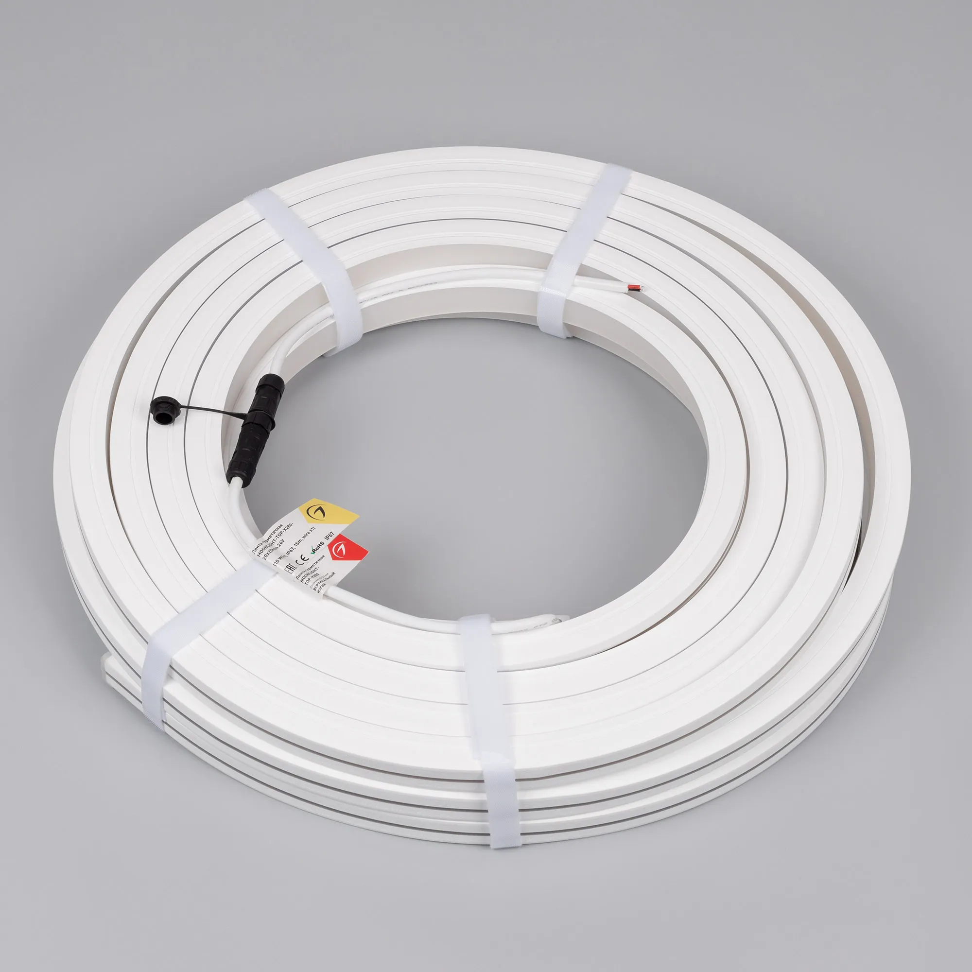 Гибкая герметичная лента (неон серии MOONLIGHT), сечение 20×20 мм. Светодиоды CSP 280 шт/м. Цвет свечения ТЕПЛЫЙ (3000К), индекс цветопередачи CRI>90, световой поток 480 лм/м, угол излучения 114°. Мощность 10 Вт/м, питание 24 В. Класс пылевлагозащиты IP67. Размеры 15000×20×20 мм. Мин. отрезок 50 мм. Вертикальный изгиб TOP, минимальный радиус изгиба 180 мм. Катушка 15 м. Цена за 1 м. Гарантия 5 лет.