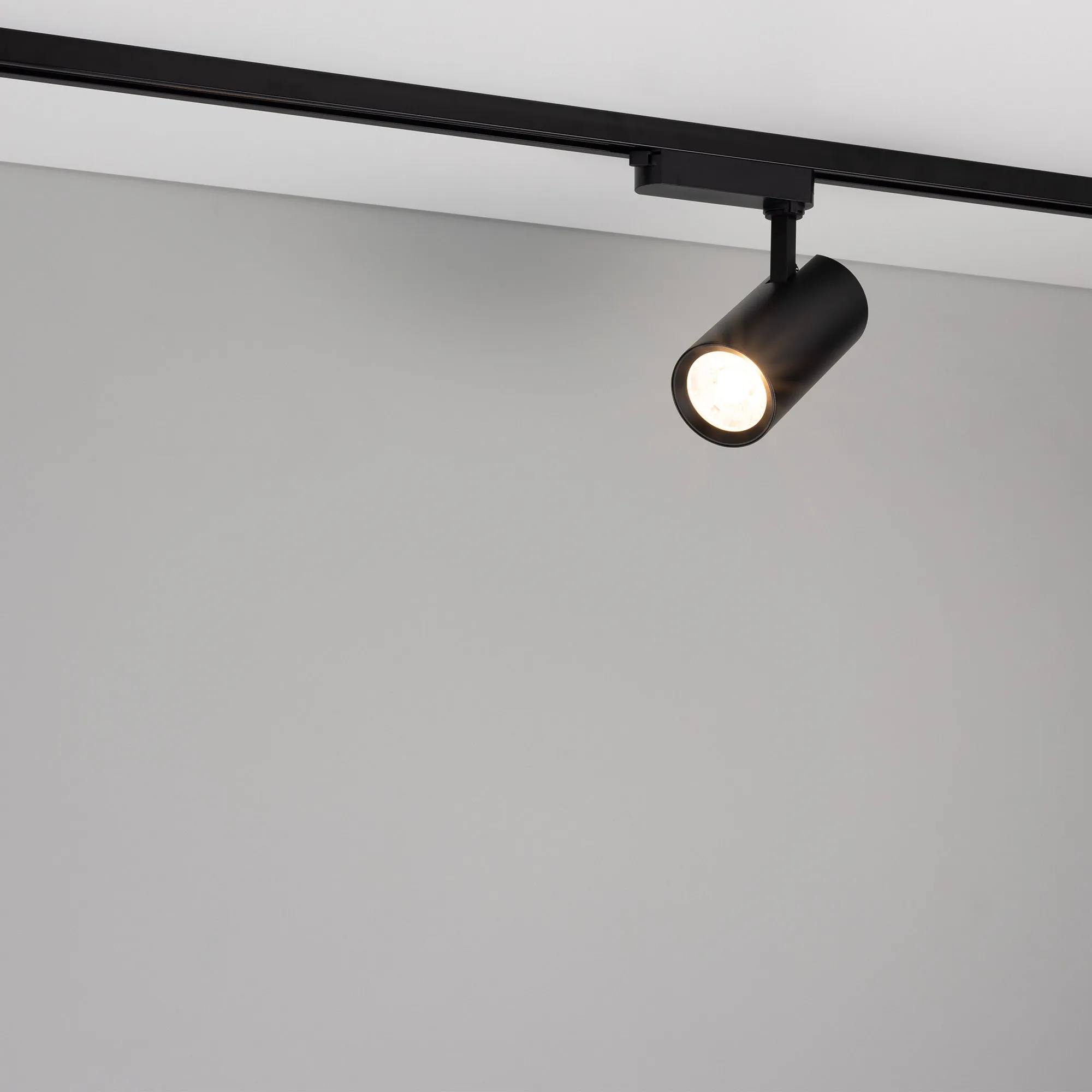Светильник для треков/шин 2 провода. Мощность 20 Вт, св. поток без решетки honeycomb 2000 лм, 100 лм/Вт, с решеткой honeycomb 1320 лм, 66 лм/Вт, дневной 4000 K, CRI>90, угол 55°, напряжение питания 230 В. Черный круглый корпус из алюминия, материал линзы PMMA, степень защиты IP20. Размер: диаметр 74 мм, длина световой части 154 мм. Монтаж на трек 1-фазный. Драйвер встроенный 500 мА 25-40 В, пульсация <5%.