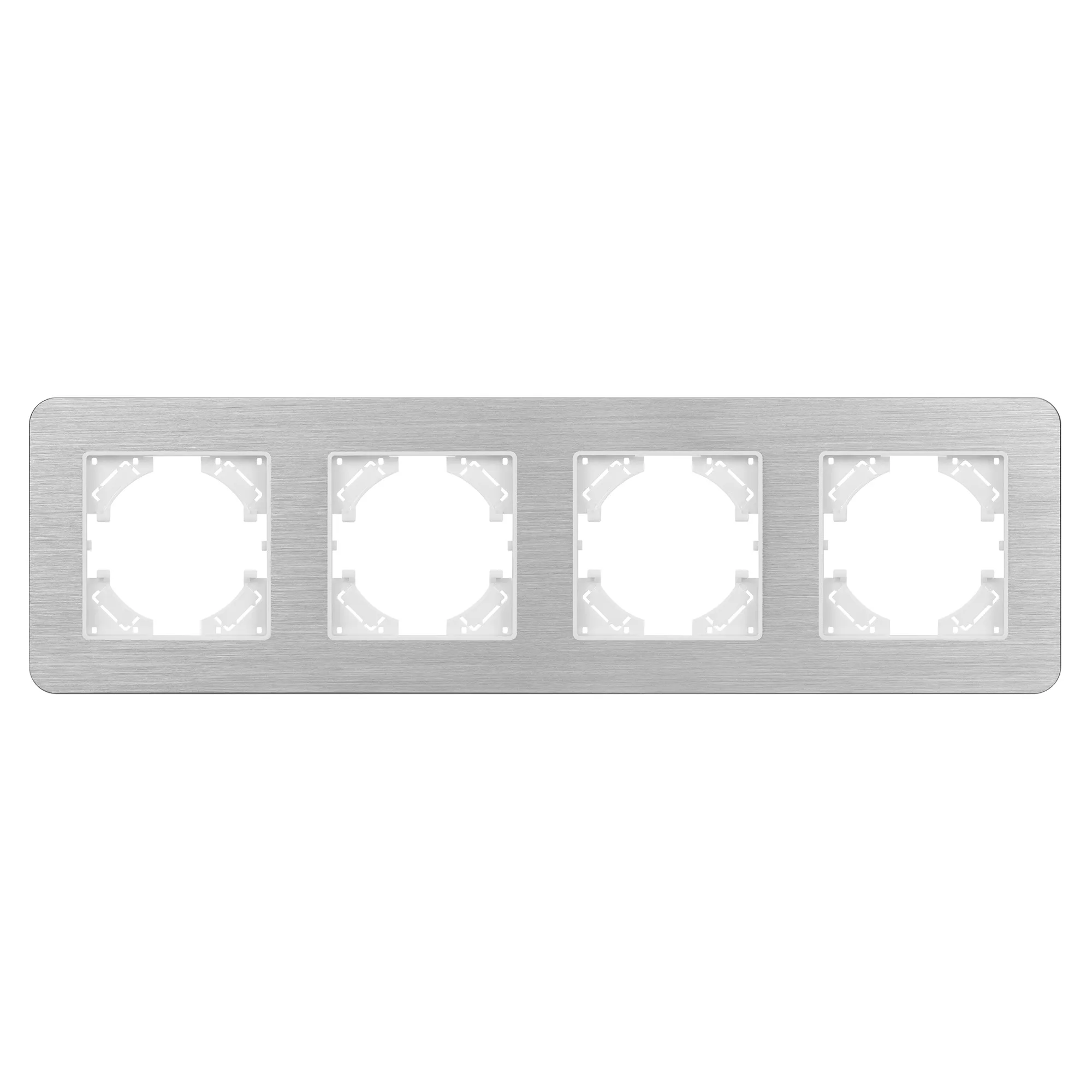 Рамка алюминиевая на 4 поста, под встраиваемый механизм. Цвет - серебристый. Среднего уровня герметичности IP20. Ориентация монтажа - горизонтальная (основным ориентиром служат посадочные выступы для накладки механизма).