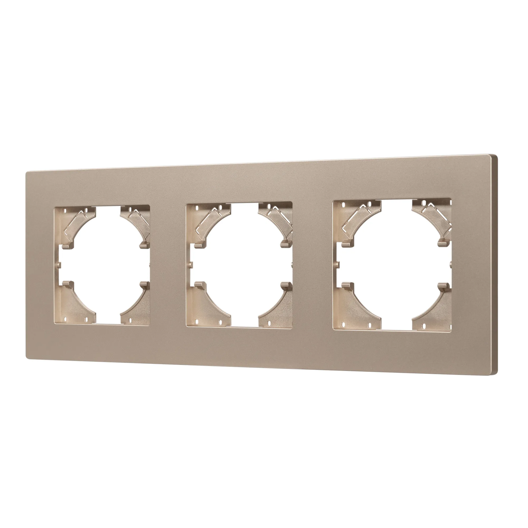 Рамка пластиковая на 3 поста, под встраиваемый механизм. Цвет - золотой. Среднего уровня герметичности IP20. Ориентация монтажа  - горизонтальная (основным ориентиром служат посадочные выступы для накладки механизма).