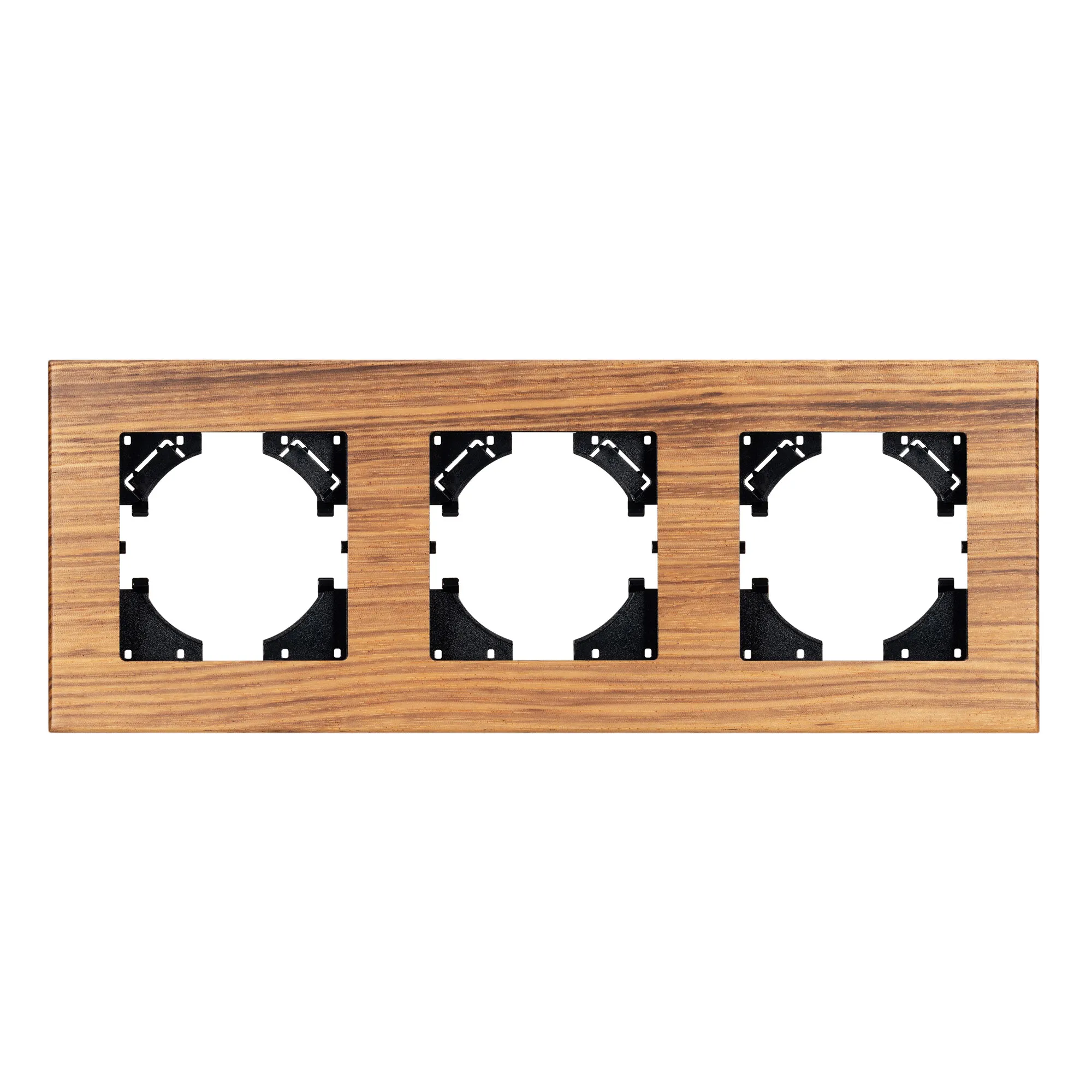 Рамка пластиковая на 3 поста, под встраиваемый механизм, с накладкой из натурального дерева. Цвет накладки - натуральное дерево* (осветленный), цвет рамки - черный. Среднего уровня герметичности IP20. Ориентация монтажа - горизонтальная (основным ориентиром служат посадочные выступы для накладки механизма).