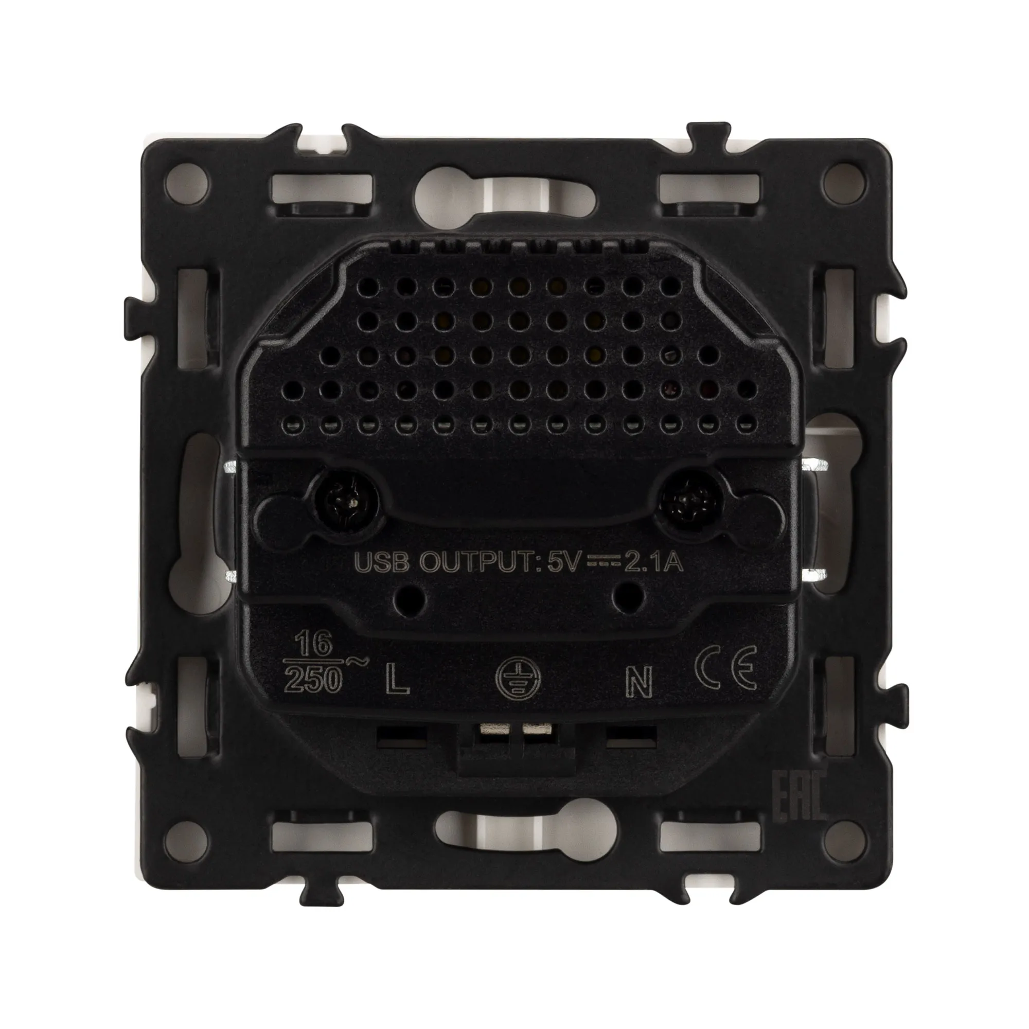 Механизм розетки с заземлением на 1 пост и 2USB Type A порта. Цвет - золотой, с Soft-Touch покрытием. Без фронтальной рамки. Уровень пылевлагозащиты IP20. Розетка устанавливается в стандартный подрозетник круглого сечения диаметром 60мм.