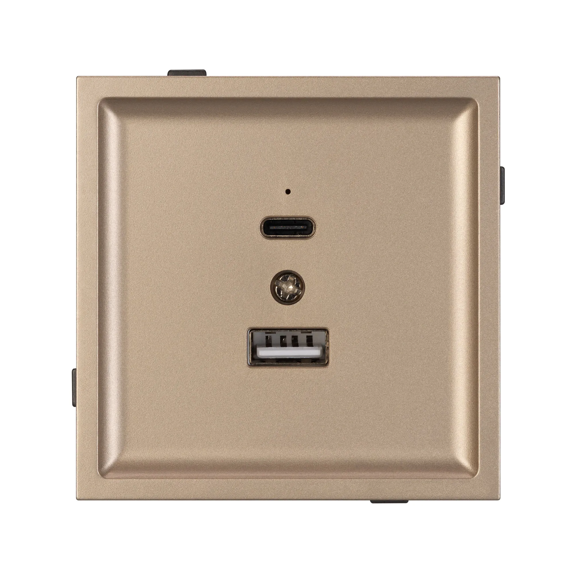 Механизм USB розетки на 2 порта Type A + Type C. Цвет - золотой. Без фронтальной рамки. Выходная мощность для USB Type C порта не превышает 20W. Уровень пылевлагозащиты IP20. Устанавливается в стандартный подрозетник круглого сечения диаметром 60мм.