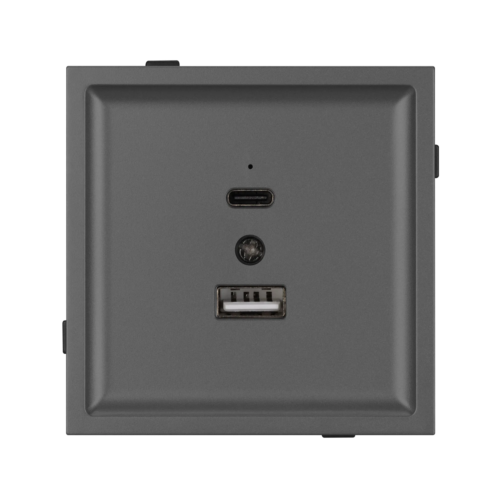 Механизм USB розетки на 2 порта Type A + Type C. Цвет - серый, с Soft-Touch покрытием. Без фронтальной рамки. Выходная мощность для USB Type C порта не превышает 20W. Уровень пылевлагозащиты IP20. Устанавливается в стандартный подрозетник круглого сечения диаметром 60мм.