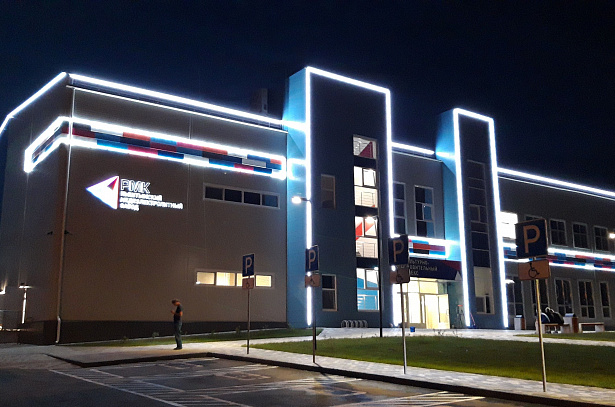 Контурная подсветка фасада — простое и в то же время беспроигрышное решение для зданий самого разного назначения. Именно этот прием освещения стал основным при оформлении физкультурно-оздоровительного комплекса АО «КЭМЗ» (АО «РМК»).