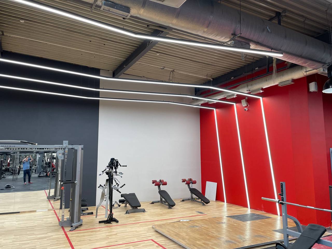 Просторный и стильный тренажерный зал оборудован новейшей техникой для эффективных и безопасных тренировок. Особую атмосферу в зале создает тщательно продуманное освещение. Оно не только не мешает во время тренировок, но и привносит в пространство футуристические мотивы. Подсветка из линий света на стене переходящая в основное освещение выполненное в форме зиг-загов, сделанная благодаря точным расчетам и правильным запилам профиля задает мотивирующий настрой.