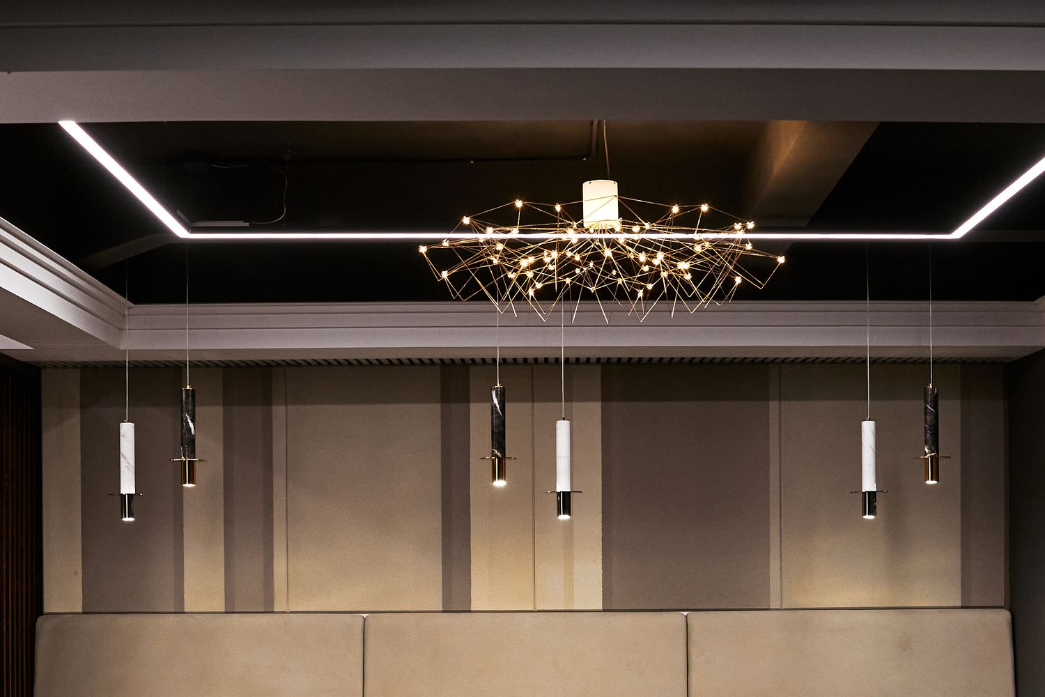 Свет играет большую роль в создании комфортного пространства. Линейные светильники отлично подошли для этого проекта. За счет световых линий на стенах в пространстве создается впечатляющий контраст темного помещения с яркими световыми полосами.
